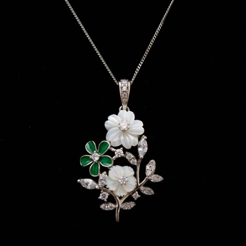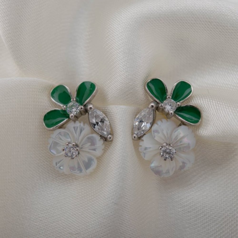 • إن المنتج يوجد بها زوجين من الحلق المميزين تم تصميمه أيضاً يحتوي على أجزاء من الصدف الملون من الفضة على شكل ورود ويوجد به فصوص الزركون ايضاً.