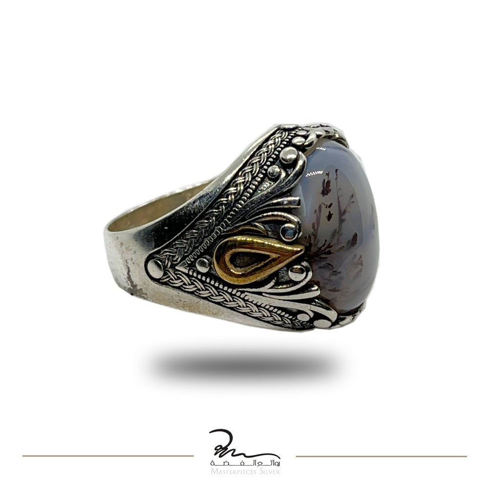 صمم خاتم عقيق رجالي من الفضة بلون مميز للغاية، حيث جاء باللون الأزرق ممزوج بالابيض ويحتوي في أطرافه نقشات من االفضةوالذهبي، وجاء بشكل بيضاوي يحتوي في منتصفه على حجر العقيق اليماني الفخم.