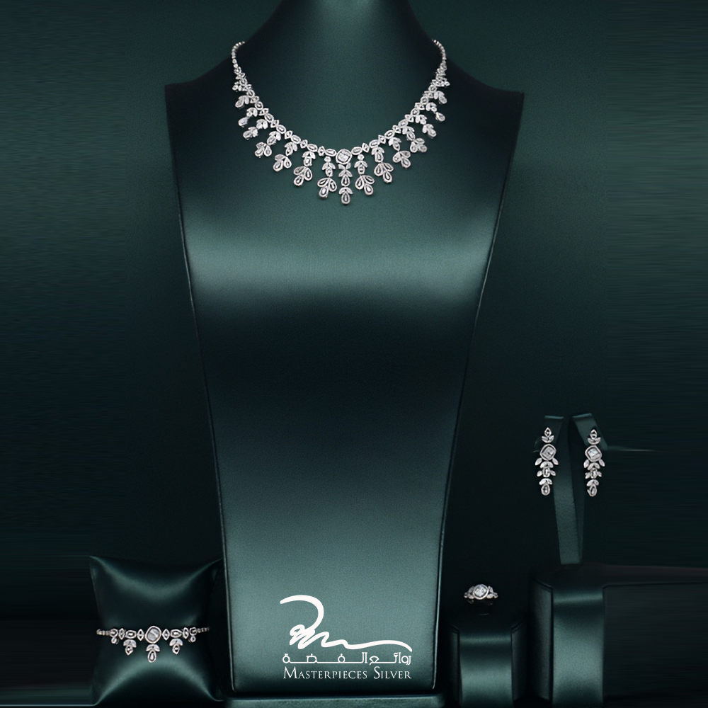 ويحتوي الطقم الفضة على( عقد وخاتم و إسورة وحلق طويل) تم تصميمهم بشكل راقي للغاية، ويتزينوا بأحجار الزركون الماسية.