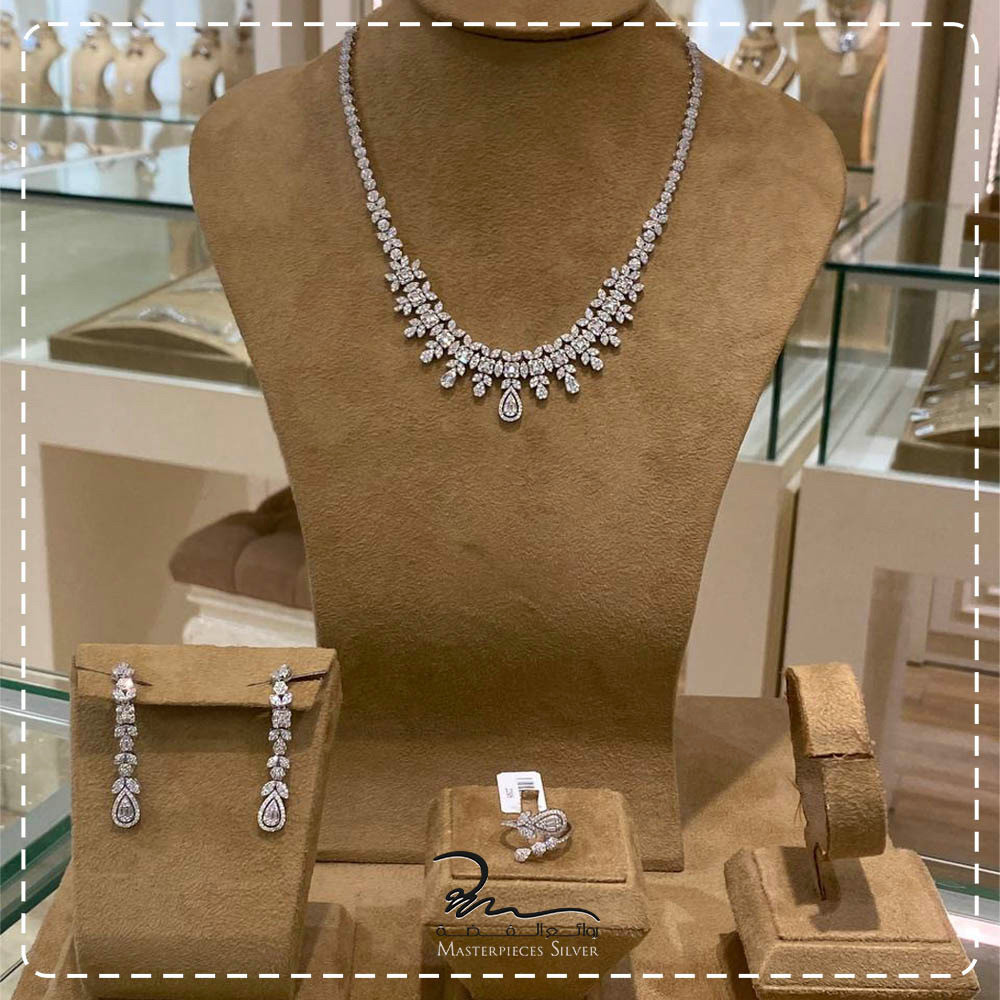 أطقم فضة تصميم الماس للمناسبات وحفلات العروس، تقدم روائع الفضة مجموعة متنوعة من المجوهرات الفضة الماسية الفخمة لاطقم الفضه بتصاميم عصرية حديثة حيث زينت بأحجار الزركون مع الفضة حيث صنعت بدقة وجودة عالية على ايادي مصممين مجوهرات عالمين، براند صنع بعناية خاصة ليبقى محافظ على بريق الفضة لامعا دومآ لطقم يبقي معك في مناسباتك لتتميزي باطلالة خاطفة لامعة.