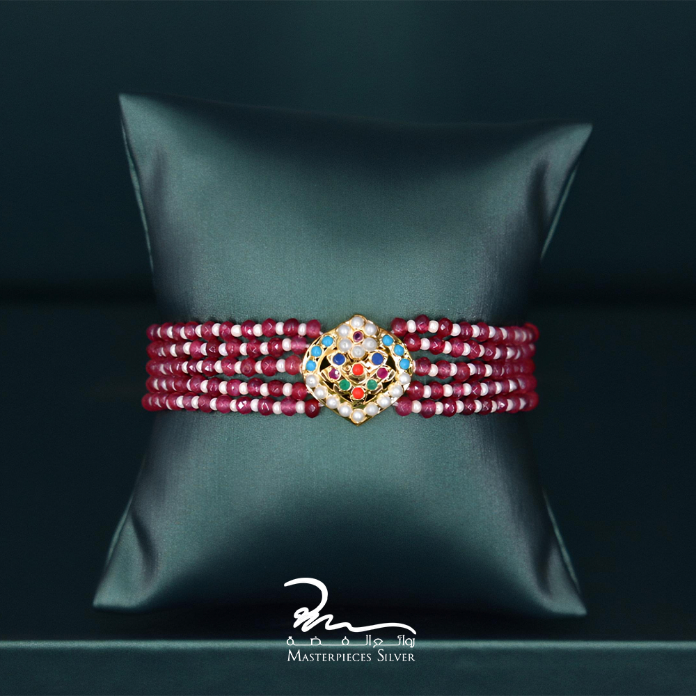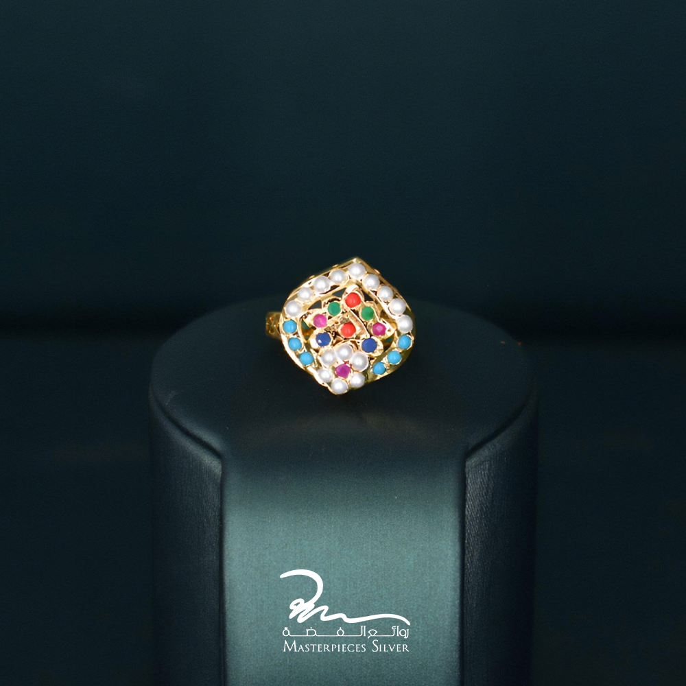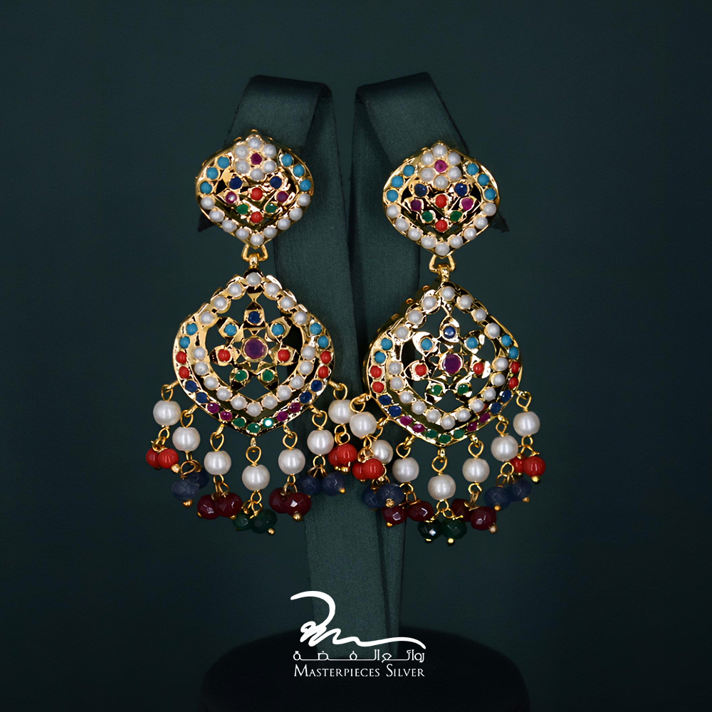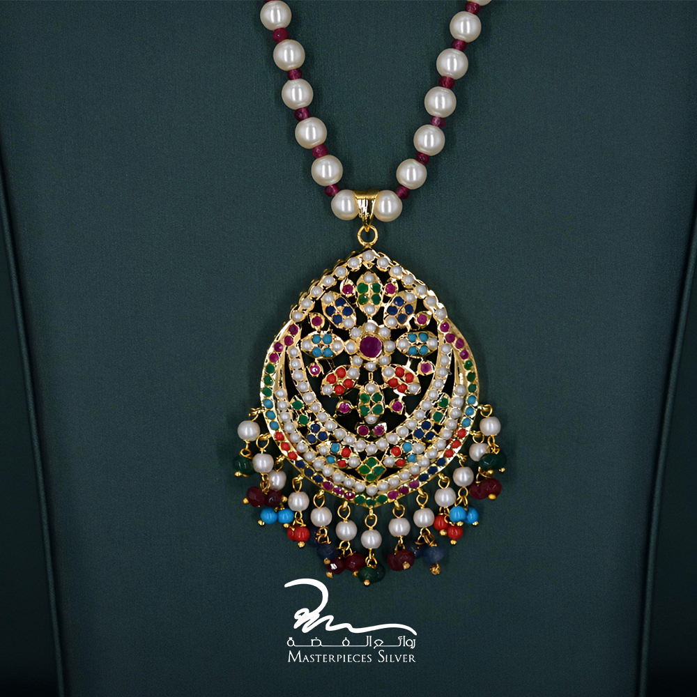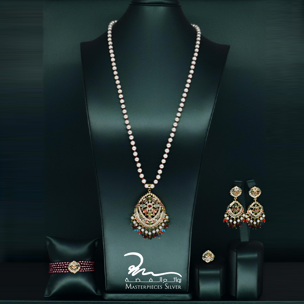 افخم طقم لولو والفضة من روائع الفضة هذا هو الاختيار المثالي لمن تبحث عن الفخامة والجمال مع لمسات من الألوان الزاهية. يتكون الطقم من عقد طويل مزخرف مع اللؤلؤ بتفاصيل فضية رائعة، أقراط، سوار، وخاتم، جميعها مزينة باللؤلؤ والأحجار الكريمة بألوان مبهجة تضفي لمسة من الحيوية والأناقة.. مصنوع يدويأ بدقة عالية.
