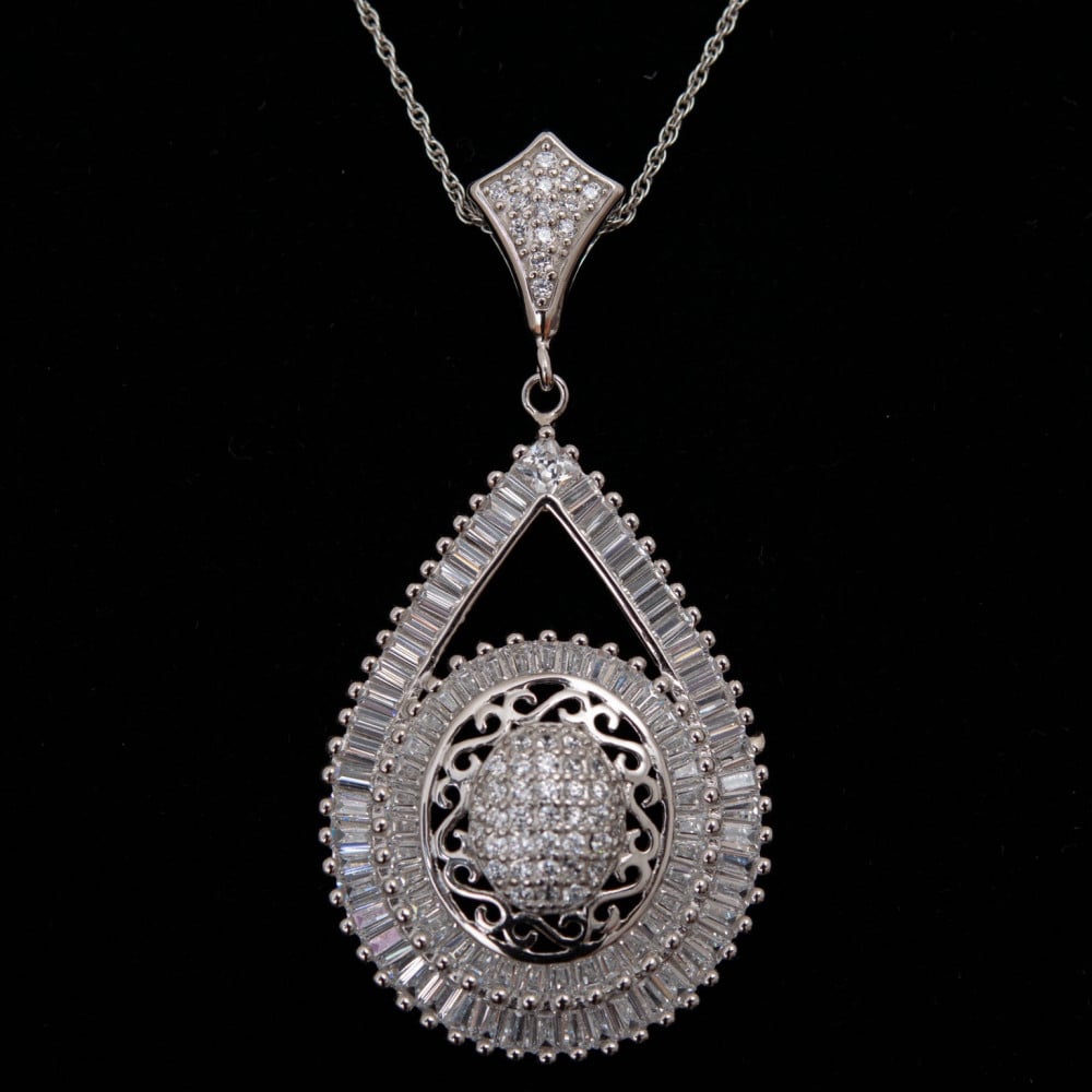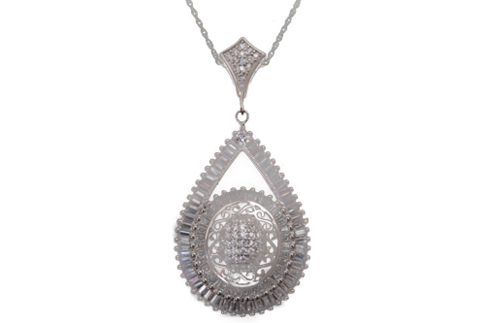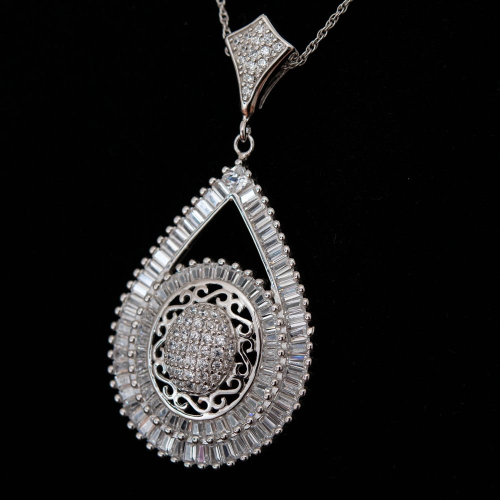 - قلادة فضة مع أحجار الباجيت الأنيق الذي على شكل حجر بارز وحوله مجموعه من الأحجار الجذابة المصنوعة من الزركون اللامع الذي يعد من أشهر وأجمل أنواع الأحجار وأكثرها قيمة.