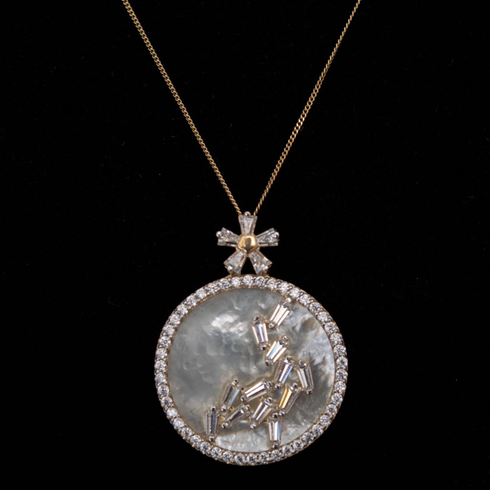 - القلادة مصممة على شكل دائرة محاطة بالماس وبداخلها بعض الخرزات الكريستالية المتناثرة وفوقها وردة صغيرة رائعة جداً
