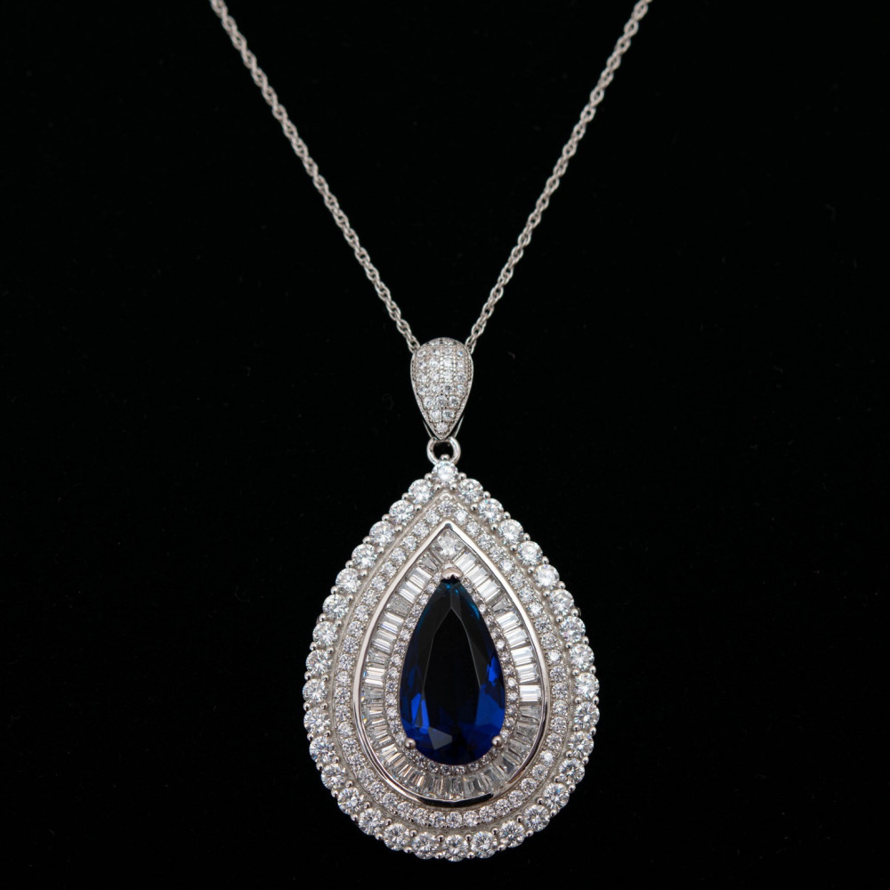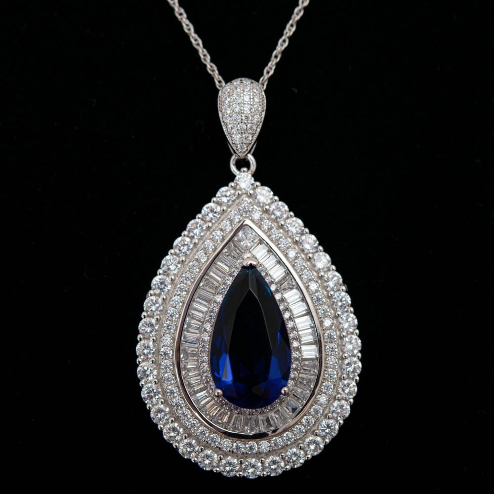 عقد فضة بأحجار الزركون به تعليقة فضة بتصميم الأجاصة عصري شبيه الألماس مع أحجار الباجيت والزركون اللامعة، تحتوى على بعض من أحجار الماس المصفوفة بشكل أنيق وجميل ن زادها حسنا وروعة.
