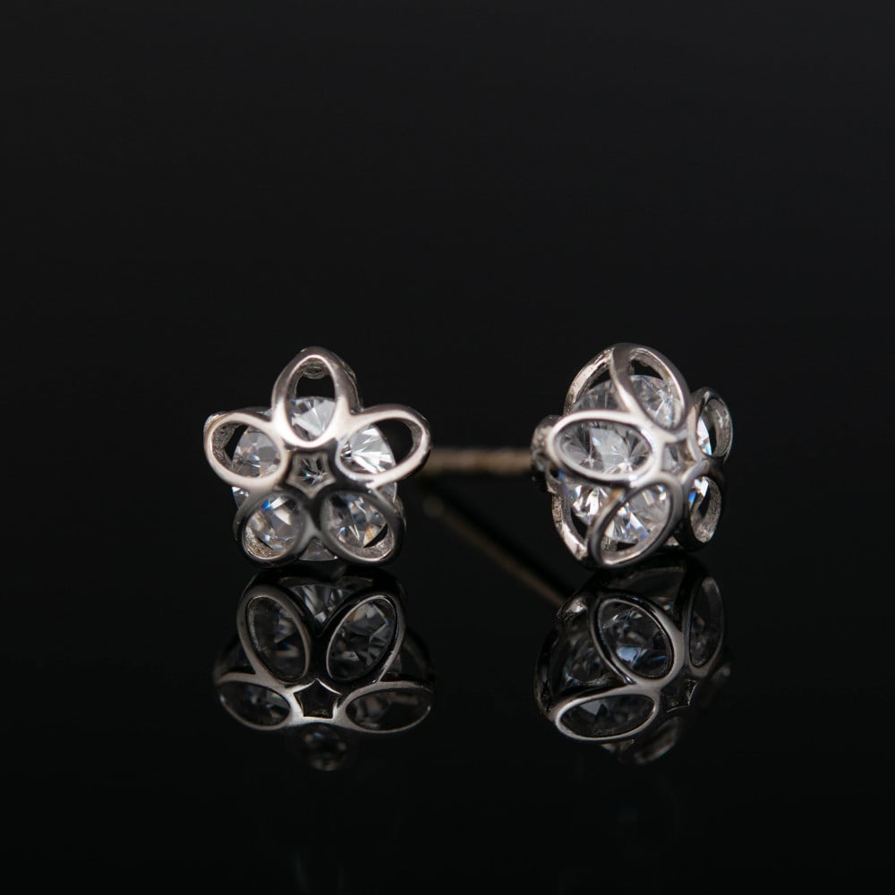 صمم حلق فضة بشكل مخفي، حيث جاء على هيئة حجر الزركون الماسي الدائري، الذي يتخفى خلف قطعة من الفضة صممت على شكل وردة، ليظهر لنا بصورة فنية غاية في الفخامة والرقي.