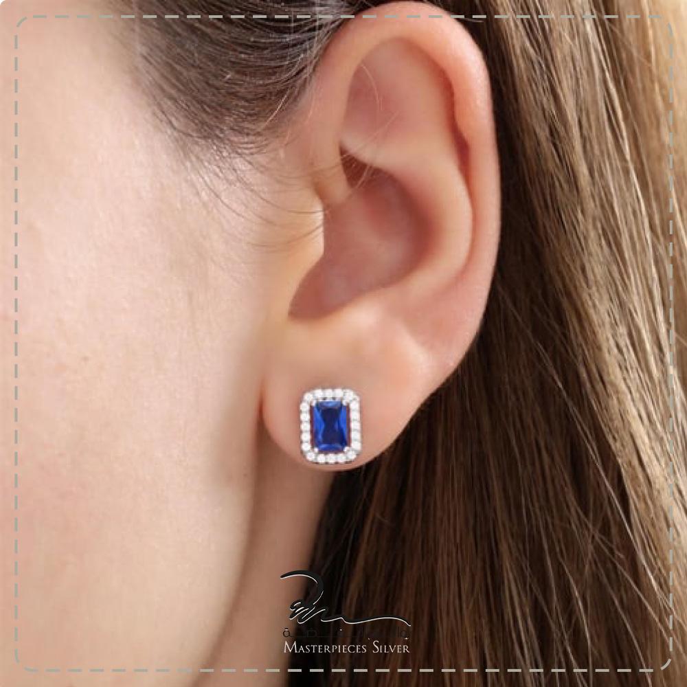 • تصميم أنيق: يتميز بتصميم مستطيل مرصع بحجر كريم أزرق محاط بأحجار صغيرة براقة، ليضفي لمسة من الفخامة على أذنك.