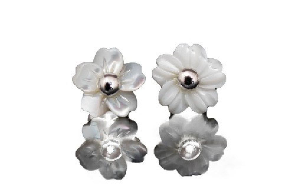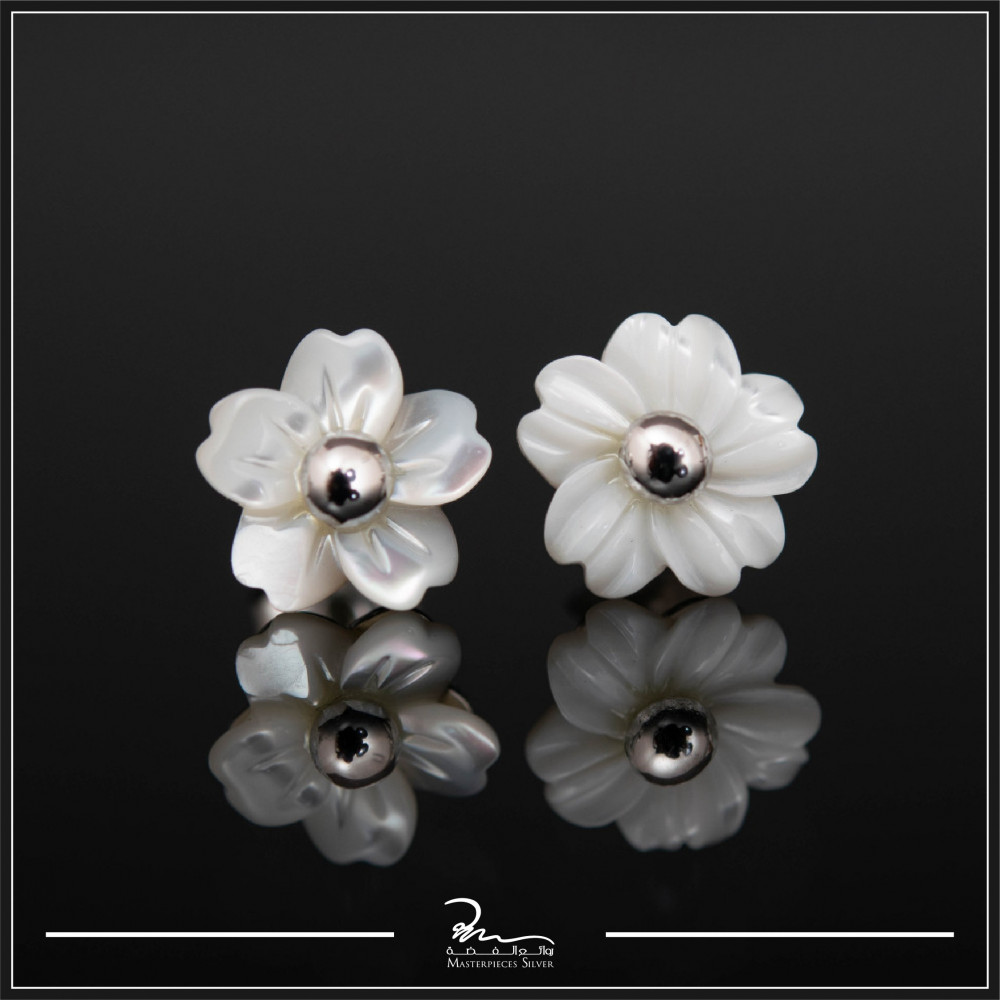 صمم حلق فضة مع الصدف، بشكل مميز للغاية حيث جاء على شكل وردة ناصعة البياض ويتربع في قلبها لؤلؤ من الصدف الفخم الذي أظهر الحلق كقطعة مجوهرات في غاية الفخامة.