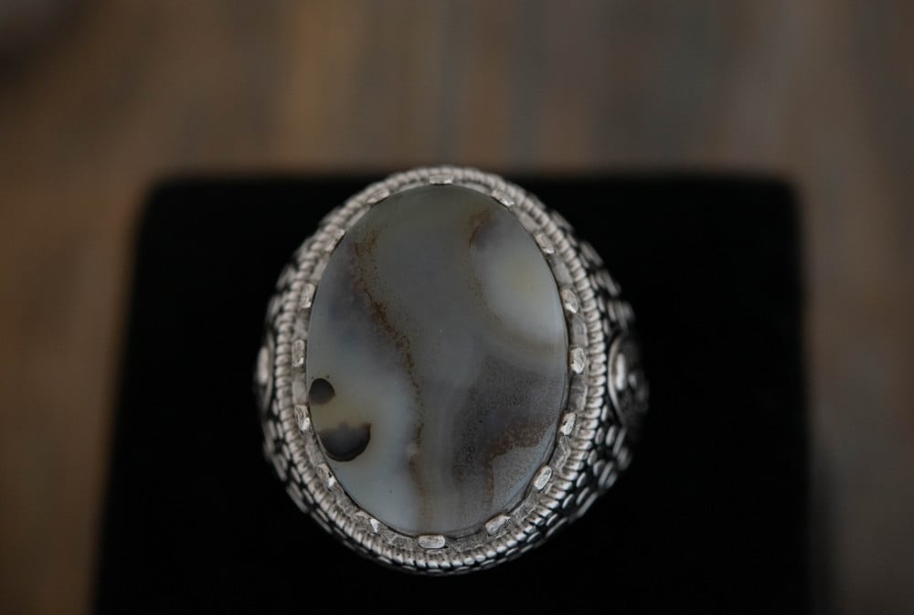 خاتم رجالي من الفضة والعقيق اليماني ممزوج بلون الاسود والفضي بيضاوي الشكل مرصع بالنقشات و الاحجار الكريمة والفضة، يتميز حجر العقيق بانه يساعد على الهدوء والتوازن ويناسب ارتداء خاتم الفضة العقيق للرجال في كل الاوقات والمناسبات.