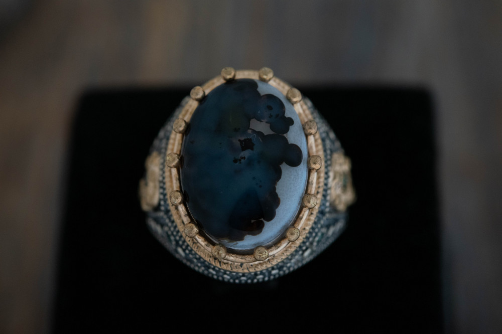 جاء تصميم خاتم رجالي من الفضة، بشكل يشبه تصميمات مجوهرات الملوك، حيث يحتوي على الشكل البيضاوي الذي تزين بحجر العقيق اليماني الفخم ويصطف حوله تصميم يشبه التاج، وجاءت حواف الخاتم بتصميم يدوي في غاية الفخامة، ليظهر الخاتم بشكل فخم وأنيق.