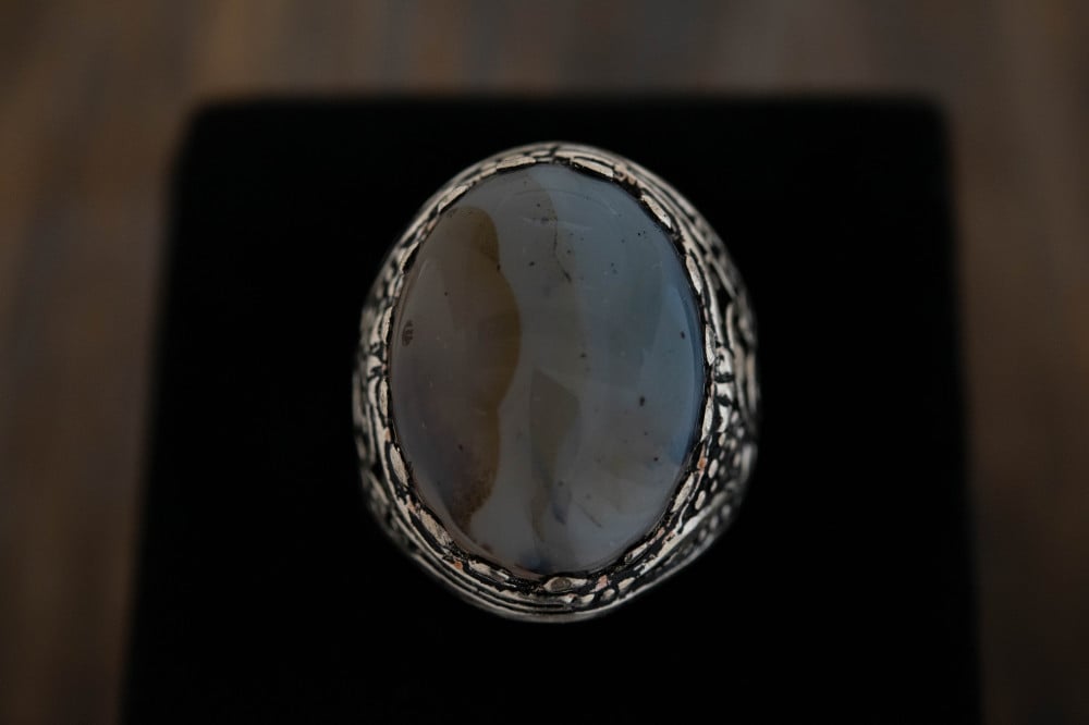 صمم خاتم رجالي بشكل فخم للغاية، حيث جاء بمزيج من اللون الفضي والأسود، ويحتوي على حجر العقيق اليماني الفخم الذي أظهره بشكل مميز للغاية، ويحتوي على بعض النقوشات اليدوية التي جعلته كقطعة مجوهرات لا يمكن الاستغناء عنها.
