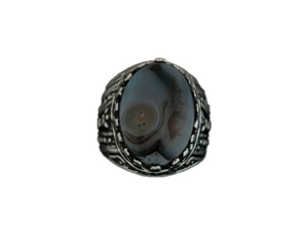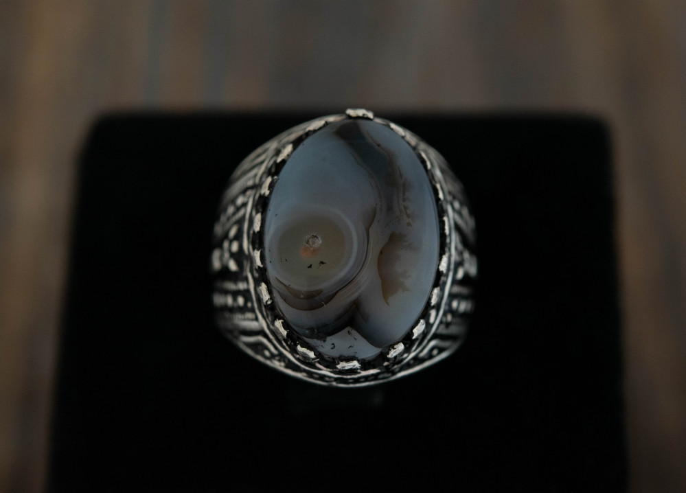 جاء خاتم رجالي، بشكل مميز ويختلف عن أي تصميم آخر، فصمم بشكل بيضاوي يتمركز بداخله حجر العقيق اليماني، ويحتوي على نقوشات تصميمها بشكل يدوي باحترافية كبيرة.