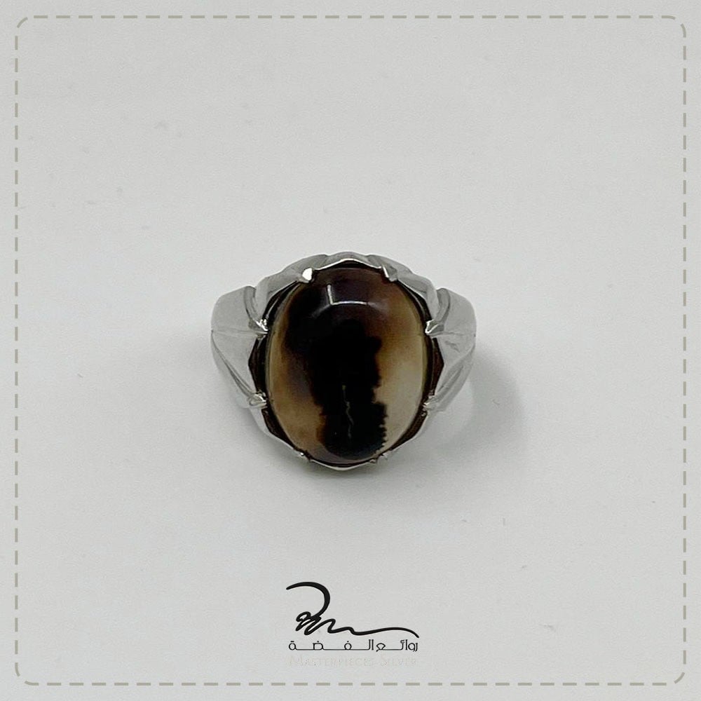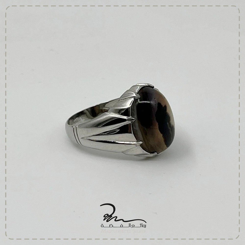 خاتم عقيق رجالي من العقيق اليماني النادر والفضة خالص عيار 925 لون مميز للغاية، خاتم تصميم فخم ويحتوي في أطرافه مزيج من الزخرفة الفضة، وجاء بشكل بيضاوي يحتوي في منتصفه على حجر العقيق اليماني الفخم.