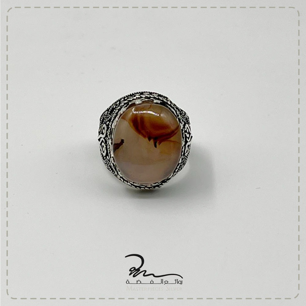 خاتم عقيق رجالي من العقيق اليماني النادر والفضة خالص عيار 925 لون مميز للغاية، خاتم تصميم فخم ويحتوي في أطرافه مزيج من الزخرفة الفضة، وجاء بشكل بيضاوي يحتوي في منتصفه على حجر العقيق اليماني الفخم.