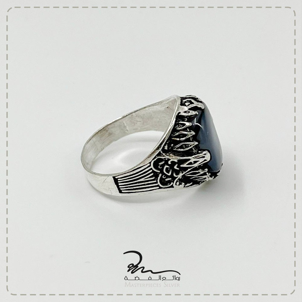 خاتم عقيق رجالي من العقيق اليماني النادر والفضة خالص عيار 925 لون مميز للغاية، خاتم تصميم فخم ويحتوي في أطرافه مزيج من الزخرفة الفضة، وجاء بشكل بيضاوي يحتوي في منتصفه على حجر العقيق اليماني الفخم.