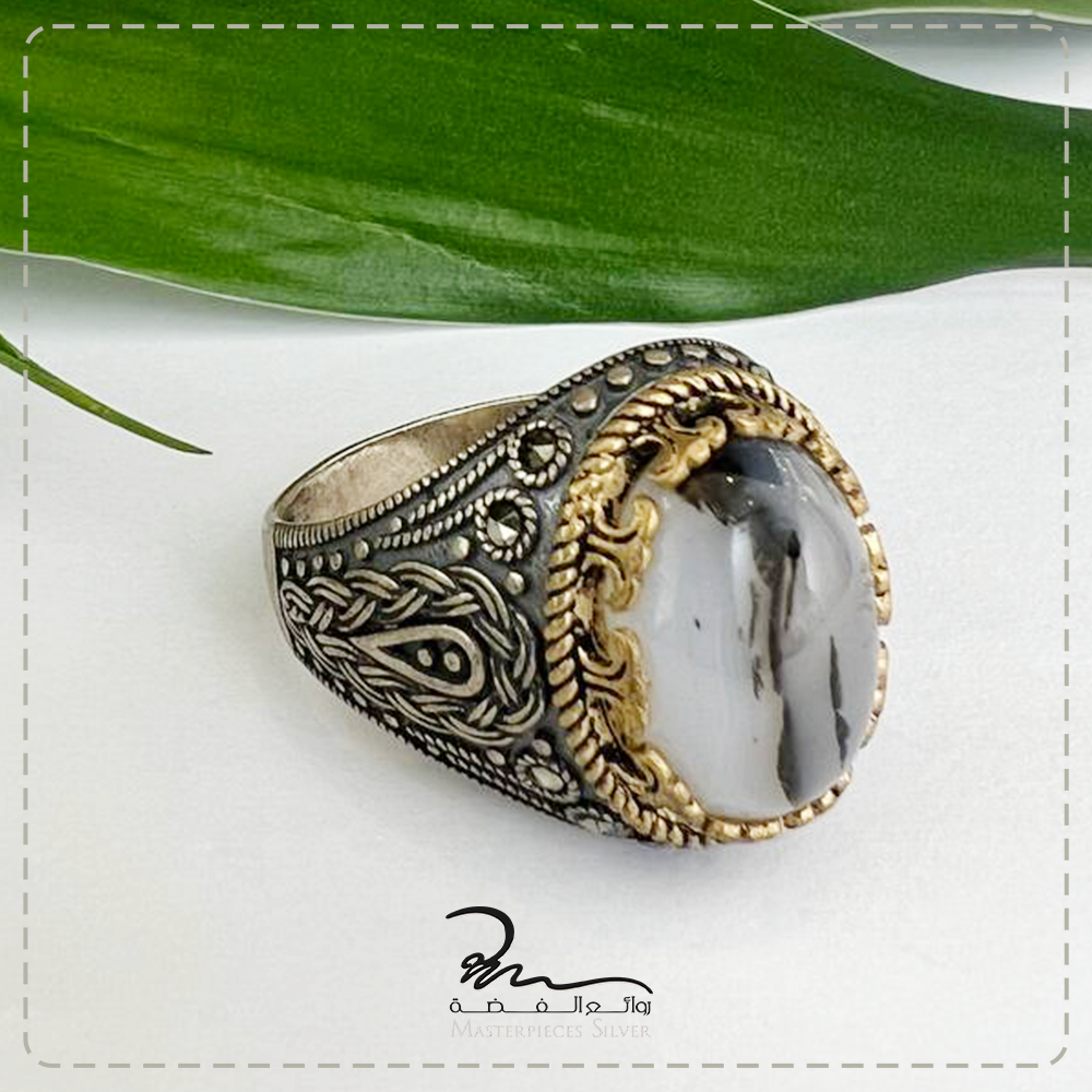 خاتم عقيق النادر اليماني رجالي من الفضة