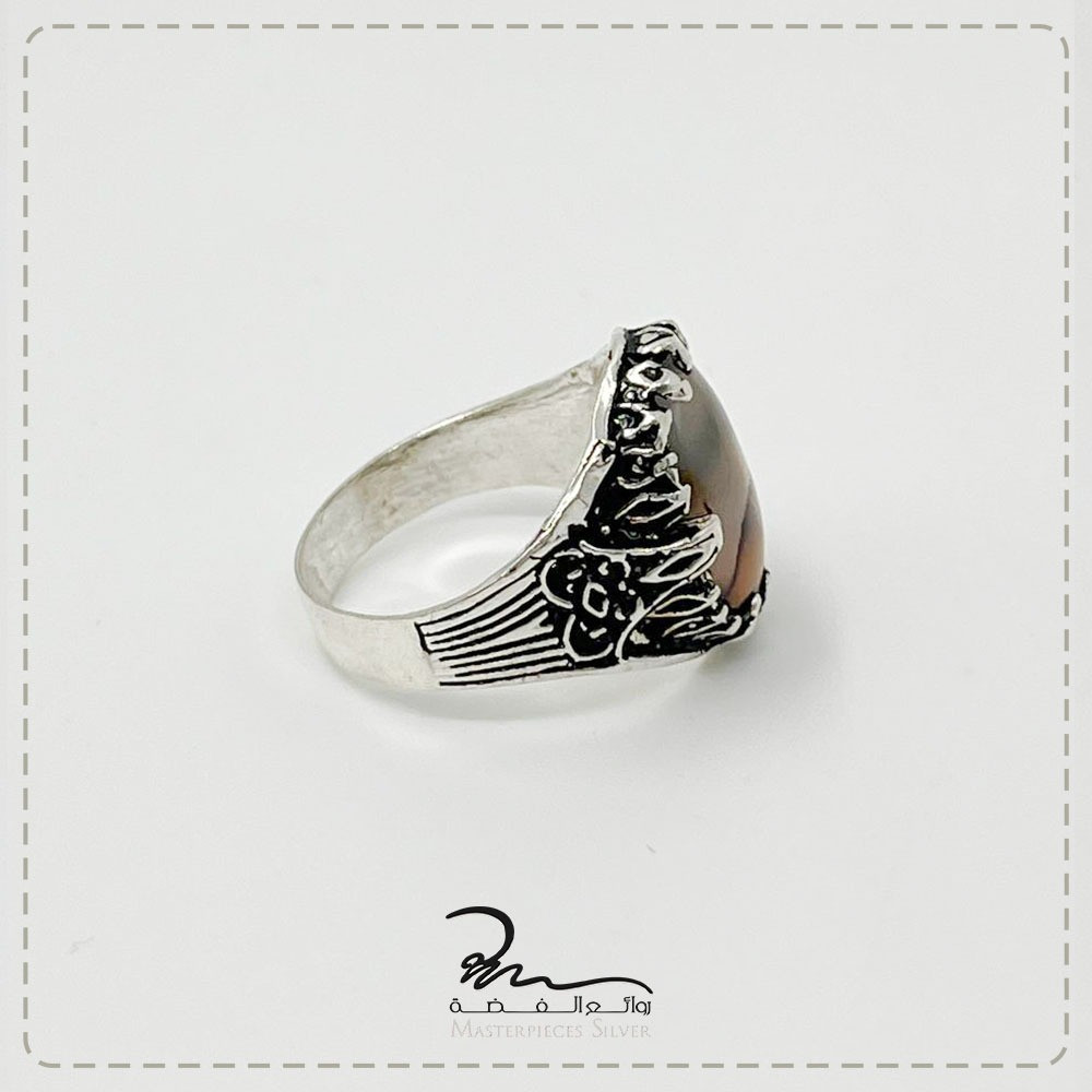 خاتم عقيق رجالي من العقيق اليماني النادر والفضة خالص عيار 925 لون مميز للغاية، خاتم تصميم فخم ويحتوي في أطرافه مزيج من الزخرفة الفضة، وجاء بشكل بيضاوي يحتوي في منتصفه على حجر العقيق اليماني الفخم.