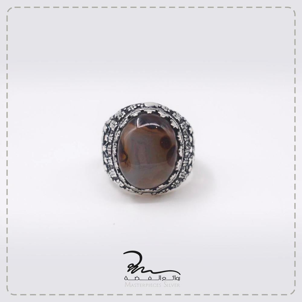 بشكل بيضاوي يحتوي في منتصفه على حجر العقيق اليماني الفخم.
