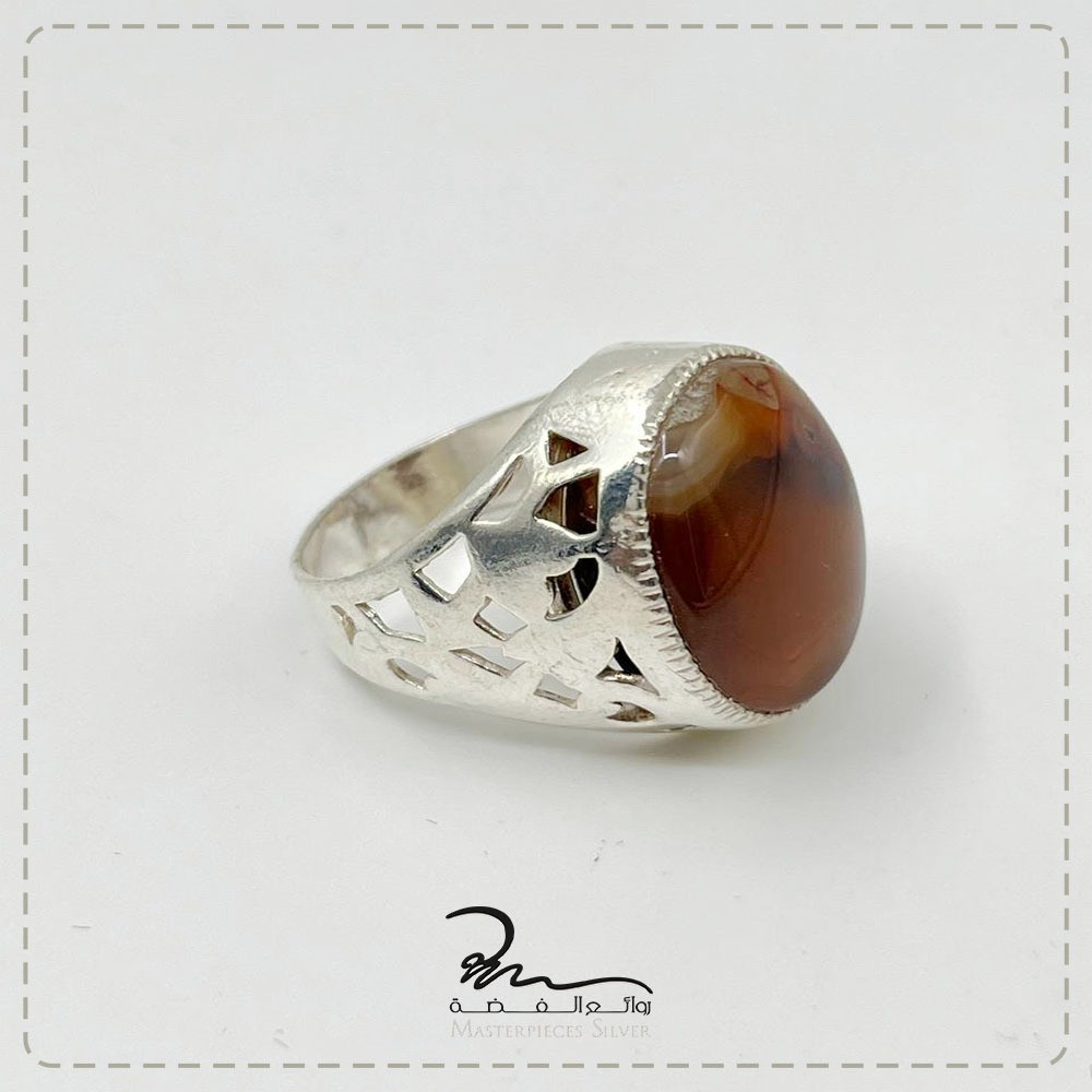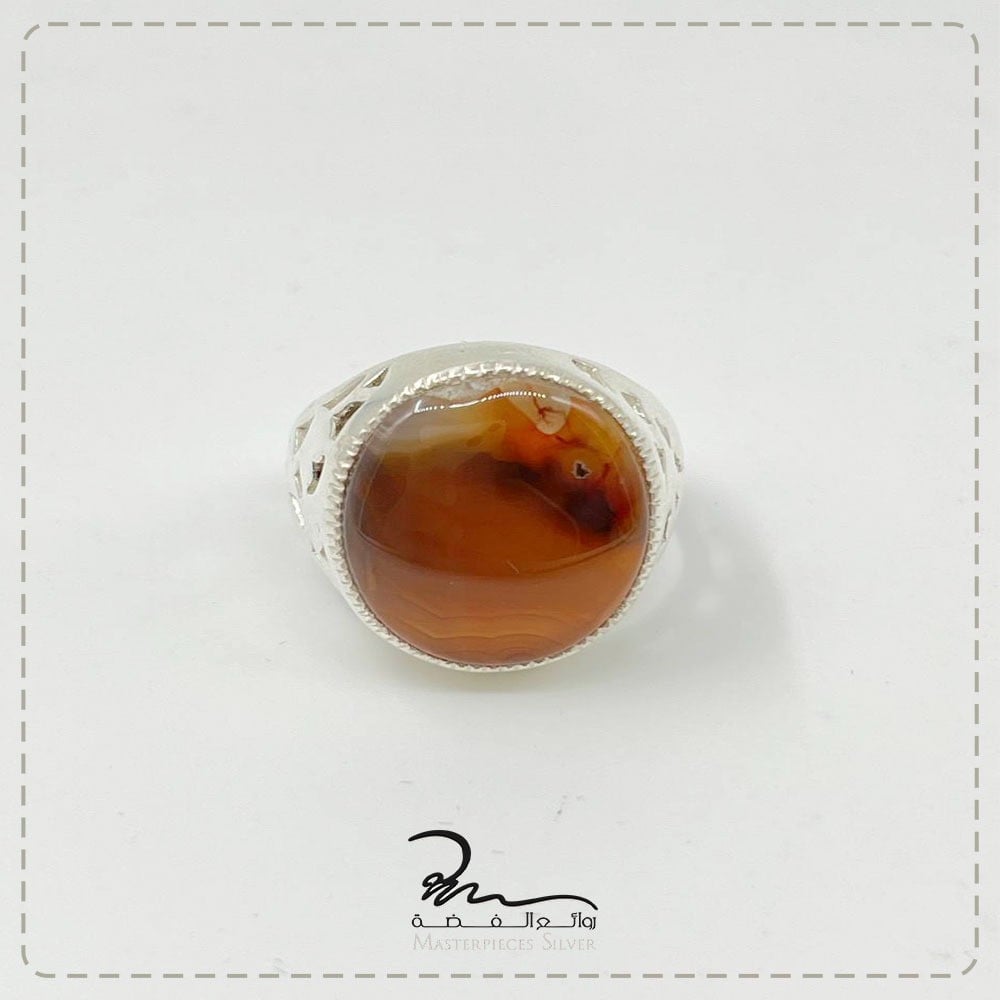 خاتم عقيق رجالي من العقيق اليماني النادر والفضة خالص عيار 925 لون مميز للغاية، خاتم تصميم فخم ويحتوي في أطرافه مزيج من الزخرفة الفضة، وجاء بشكل بيضاوي يحتوي في منتصفه على حجر العقيق اليماني الفخم.