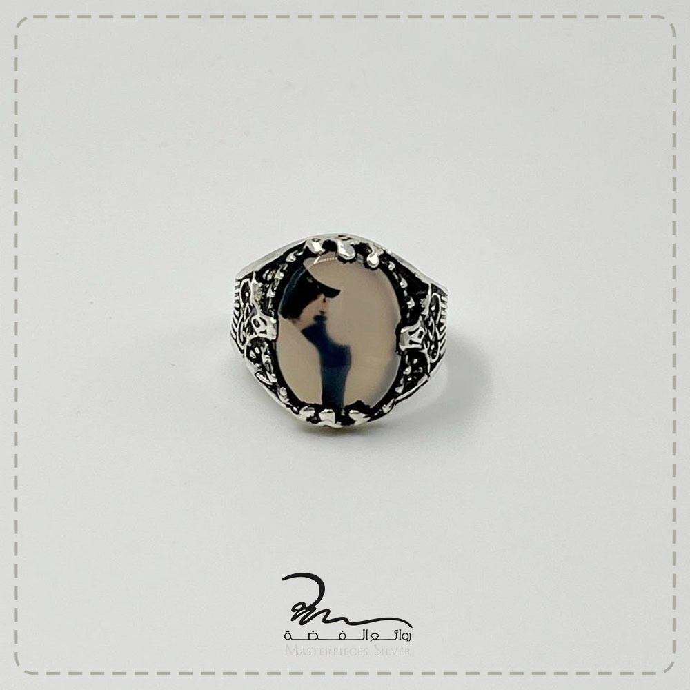 خاتم عقيق رجالي من العقيق اليماني النادر والفضة خالص عيار 925 لون مميز للغاية، خاتم تصميم فخم ويحتوي في أطرافه مزيج من الزخرفة الفضة، وجاء بشكل بيضاوي يحتوي في منتصفه على حجر العقيق اليماني الفخم.