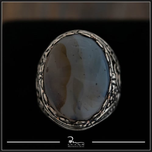 صمم خاتم رجالي من الفضة بألوان مميزة للغاية، حيث جاء الحجر الفخم ويحتوي في أطرافه اللون الفضي ونقشات فضية فخمة، وجاء
