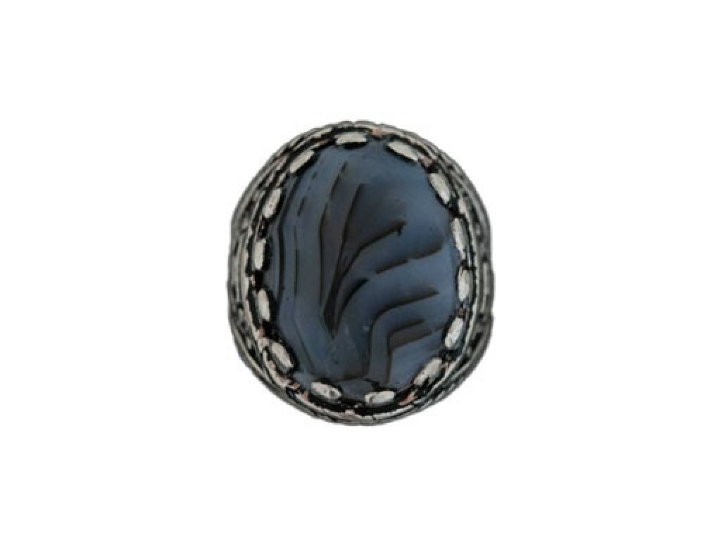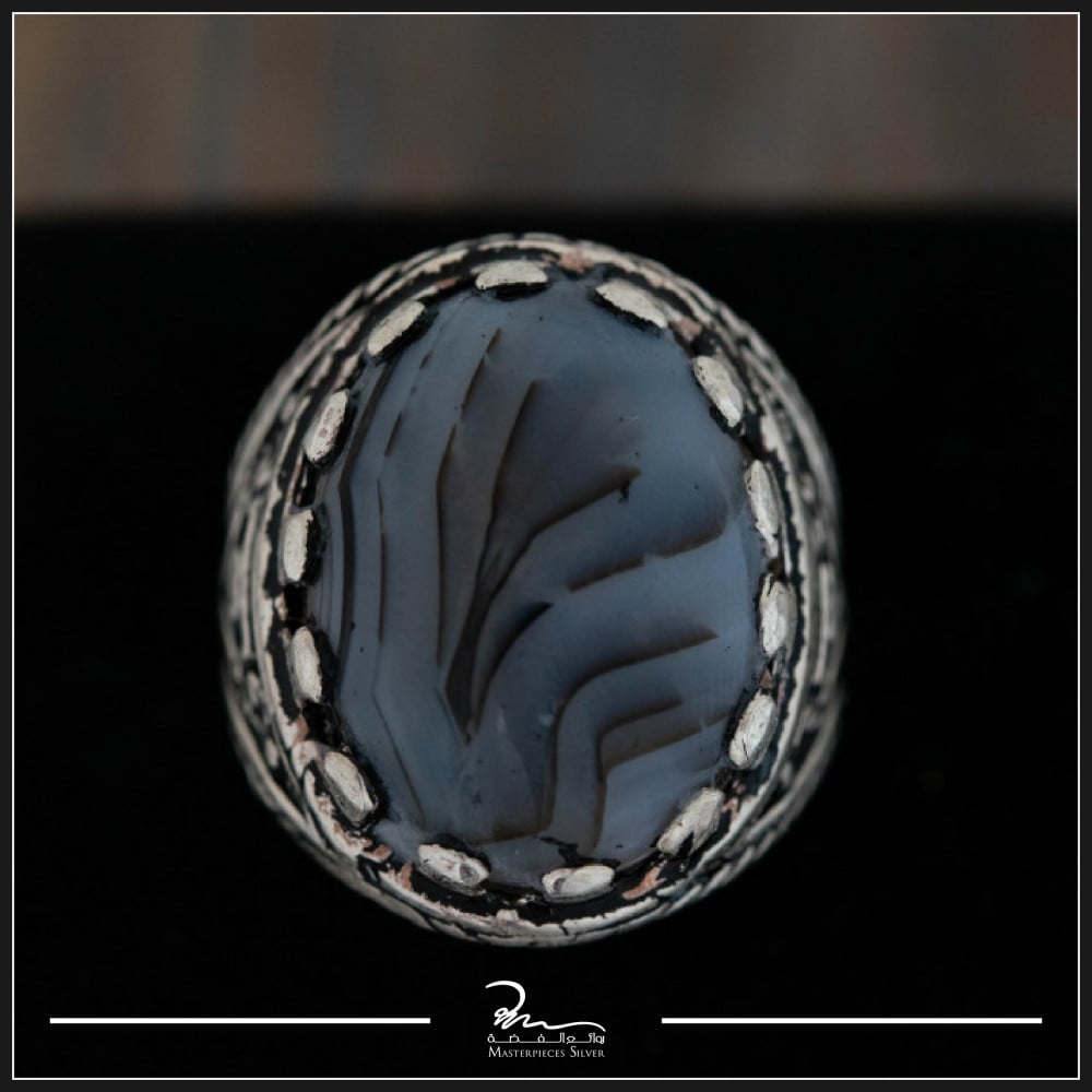 صمم خاتم فضة بشكل فخم وأنيق للغاية، فجاء بشكل بيضاوي، ويحتوي على حجر العقيق اليماني باللون الأزرق، كما تم تصميمه ببعض النقوشات اليدوية ليظهر لنا كقطعة مجوهرات في غاية الفخامة.