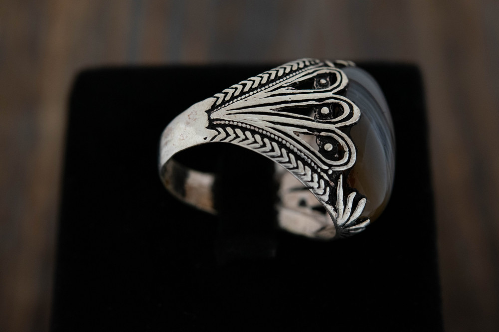 صمم خاتم فخم رجالي بتصميم جذاب ورائع حيث يفضله جميع الرجال، فيحتوي الخاتم على حجر العقيق اليماني الفخم، وجاء أيضاً ببعض النقوشات اليدوية ليظهر الخاتم في غاية الفخامة.