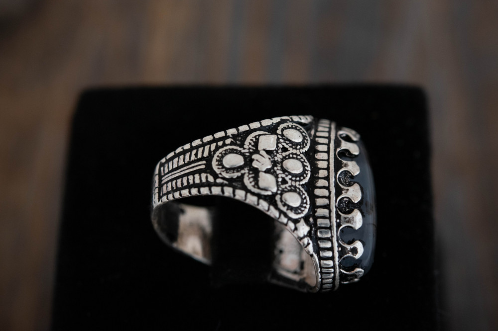 جاء تصميم خاتم فضة بشكل فخم للغاية، حيث يحتوي على اللون الفضي والأسود معاً، فجاء على شكل بيضاوي، يتمركز بداخله حجر العقيق اليماني الذي جاء على شكل رسومات بالورود الصغيرة، كما تم تصميم بعض النقوشات بجوانب الخاتم بشكل يدوي، ليظهر لنا قطعة مجوهرات في غاية الأناقة.
