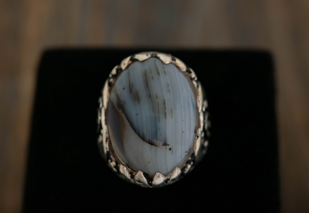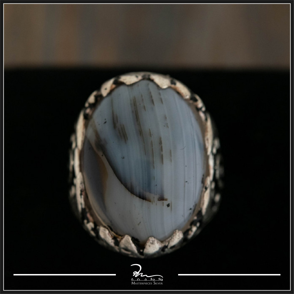 يحتوي تصميم خاتم للرجال من الفضة على شكل بيضاوي، يتمركز بداخله حجر العقيق اليماني الذي جاء باللون الأزرق الفاتح، وصممت جوانب الخاتم بشكل يشبه سن الفيل ليظهر بغاية الفخامة.