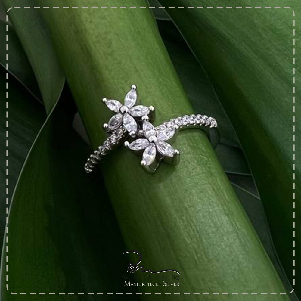 خاتم فضة بتصميم الزهور مع أحجار الزركون اللامعة للنساء✨