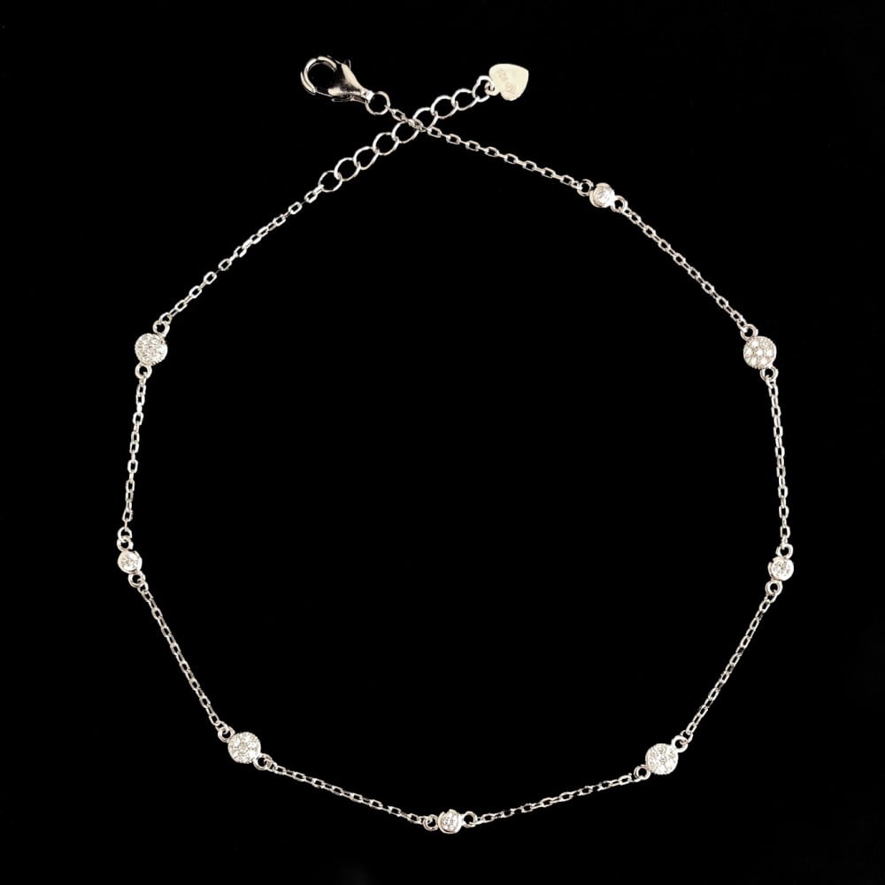 جاء تصميم خلخال انيق فضة، بشكل مميز وراقي، حيث أنه يحتوي على دوائر تشبه الكواكب والتي تزينت بحجر الزركون الماسي لتظهر لنا قطعة في غاية الأناقة والفخامة