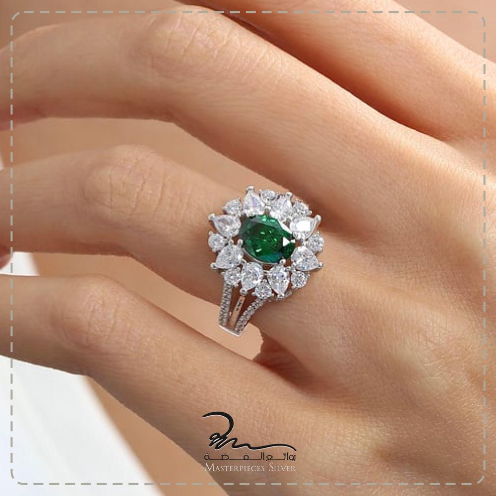 خاتم فضة فاخر يتميز بتصميمه الأنيق الذي تتوسطها حجر كريم أخضر اللون بتصميم بيضاوي محاط بأحجار كريمة شفافة تضفي عليه لمسة من الفخامة والرقي. هذا الخاتم مصنوع بدقة عالية ليمنحك مظهراً ساحراً وجاذبية لا تقاوم.