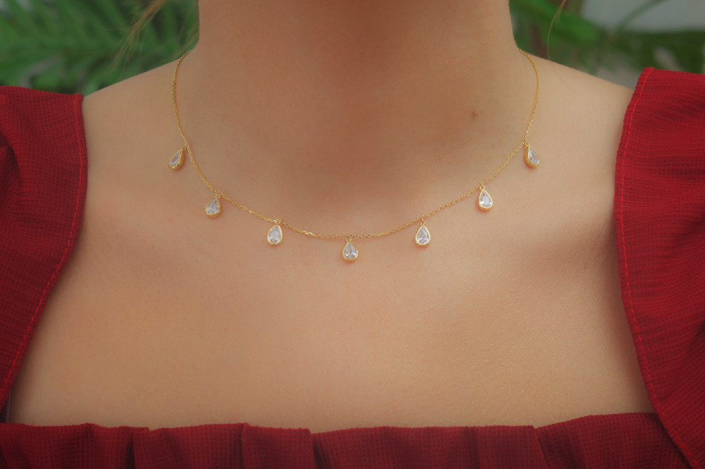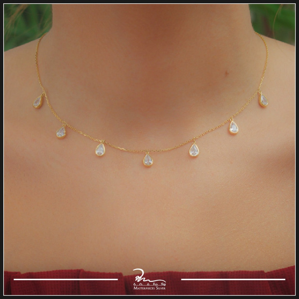 مصنوع من الفضة خالص عيار 925 وتصميم عبارة على سلسلة ناعمة وحلقات صغيرة شبه الدمعة من حجر زركون خفيف تنزل على الرقبة بنعومة.