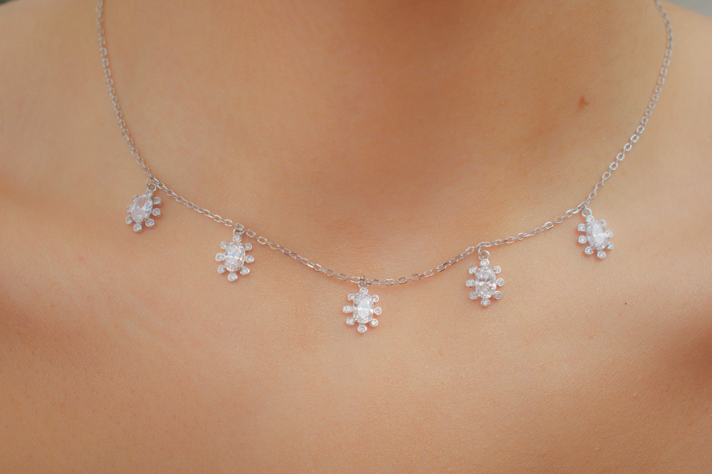 مصنوع من الفضة خالص عيار 925 وتصميم عبارة على سلسلة ناعمة وحلقات صغيرة لامعة من حجر زركون خفيف تنزل على الرقبة بنعومة.