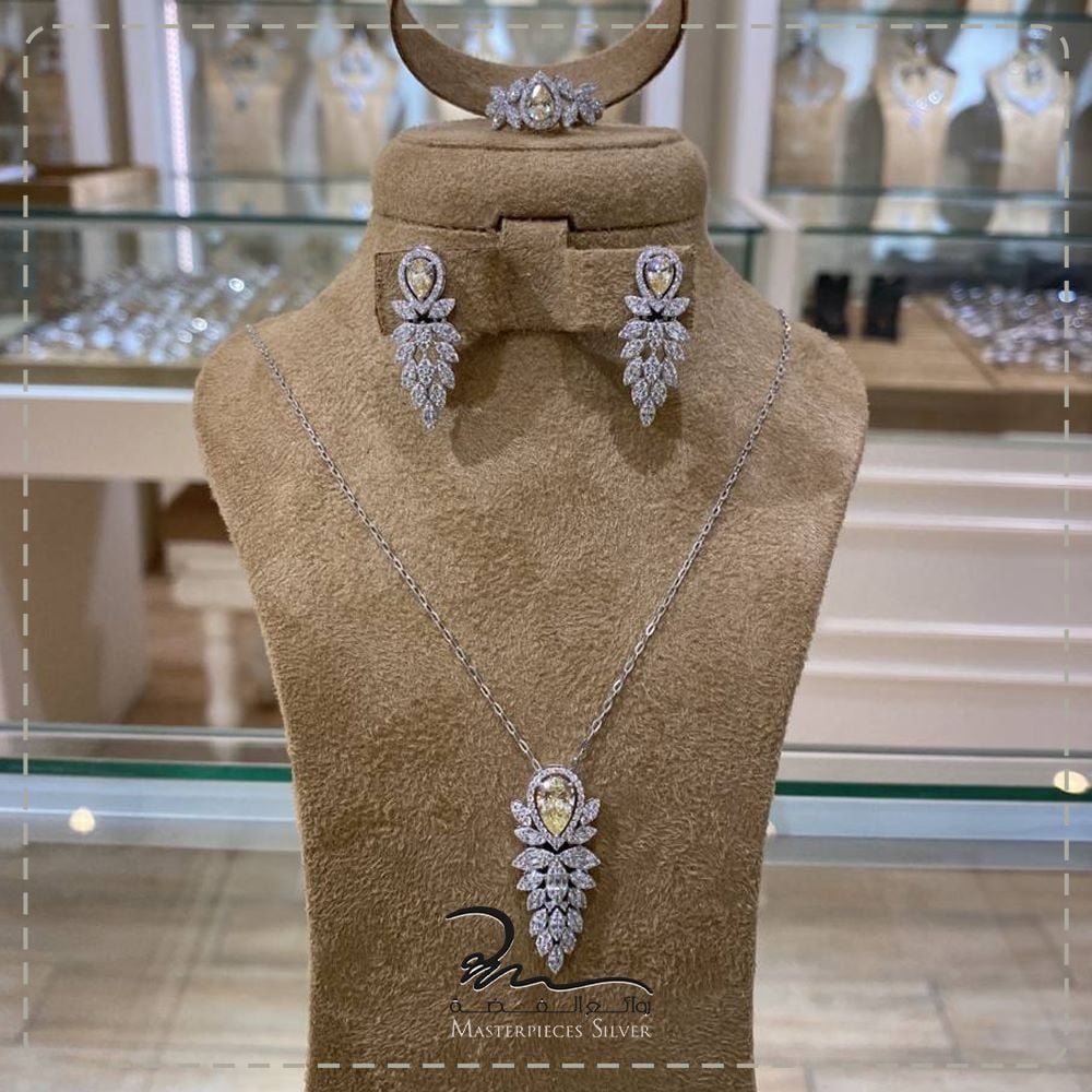 طقم فضة الماسي زركون شبيه الالماس من روائع الفضة، صمم هذا الطقم ليعطيكي اطلالة مميزة حيث صمم على أيادي مصممين عالمين لمجوهرات الفضة والاحجار الكريمه طبيعية، والفضة الخالص عيار925, جاء الطقم الفضه يجمع بين التصاميم الافتة بين الفخامة و والرقي بتصميم الطقم احجام واشكال مختلفة اوراق شجر ناعمة والقطرات بآحجار الزركون الامعة باحجام مختلفة براقة.