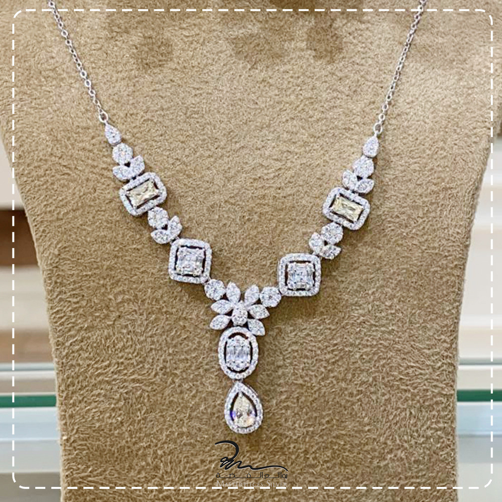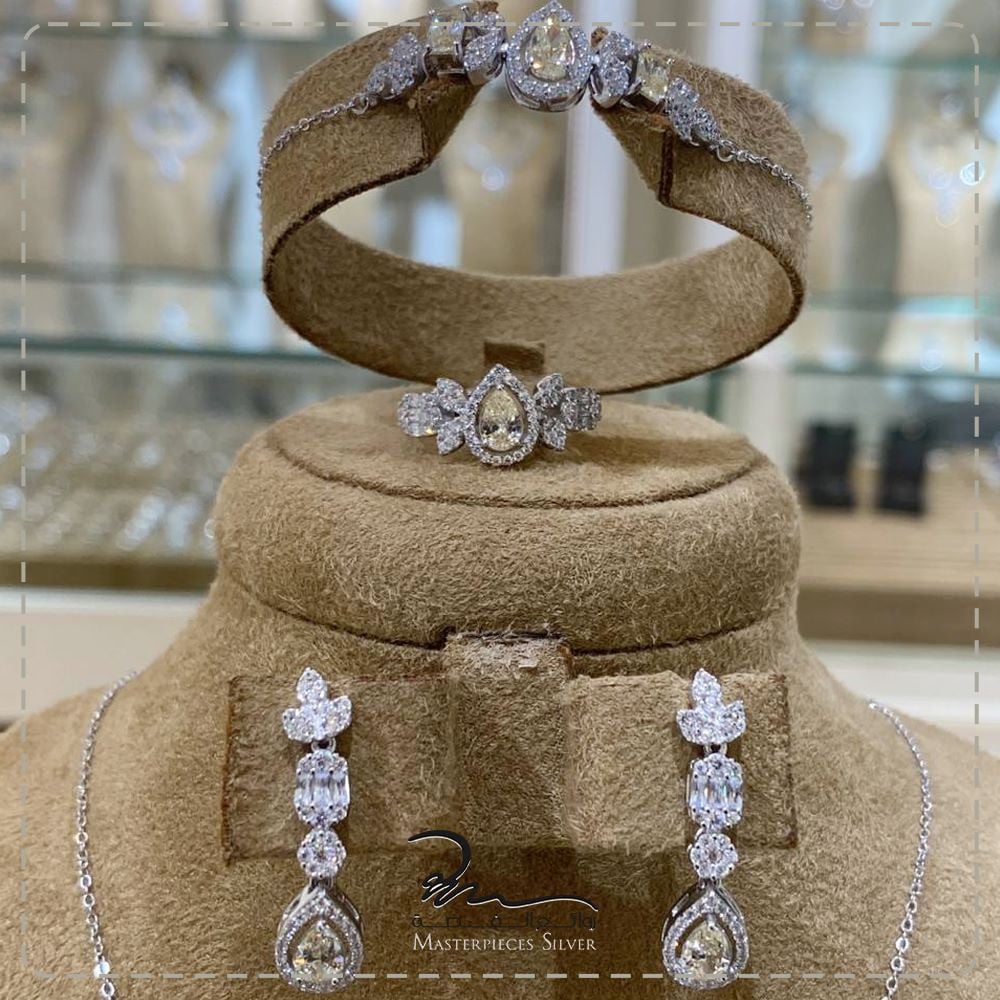 طقم فضة الماسي زركون شبيه الالماس من روائع الفضة، صمم هذا الطقم ليعطيكي اطلالة مميزة حيث صمم على أيادي مصممين عالمين لمجوهرات الفضة والاحجار الكريمه طبيعية، والفضة الخالص عيار925, جاء الطقم الفضه يجمع بين التصاميم الافتة بين الفخامة و والرقي بتصميم الطقم احجام واشكال مختلفة اوراق شجر ناعمة والقطرات بآحجار الزركون الامعة باحجام مختلفة براقة.