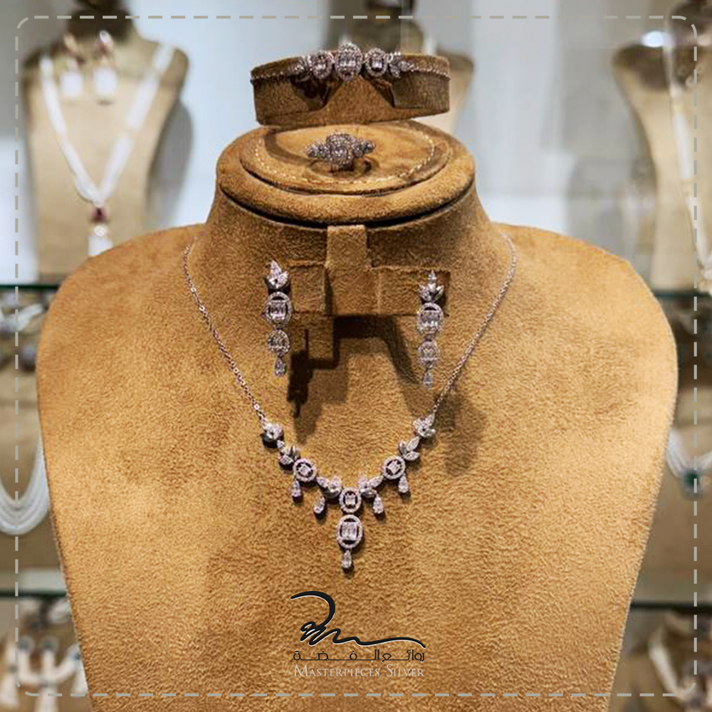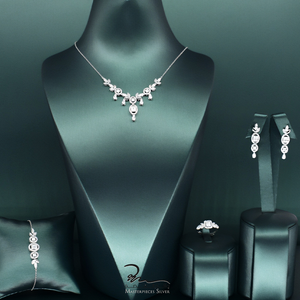 اكتشفي طقم مجوهرات فضة و زركون الفاخر المصمم بأحدث صيحات الموضة، يضم عقدًا وسوارًا وأقراطًا وخاتمًا مرصعين بالزركون شبيه الالماس النقي لإطلالة ساحرة ومميزة.