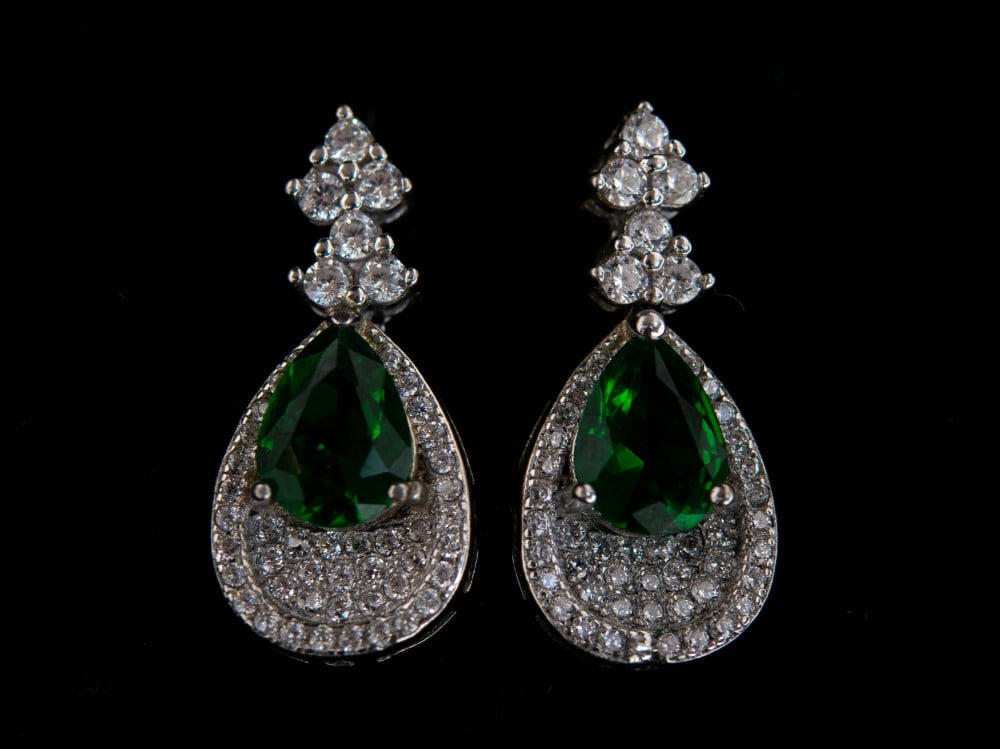 - أما الحلق فهو عبارة عن زوجين متشابهين مرصعة بالأحجار البيضاء اللامعة ويتوسطها حجر الزركون الأخضر.