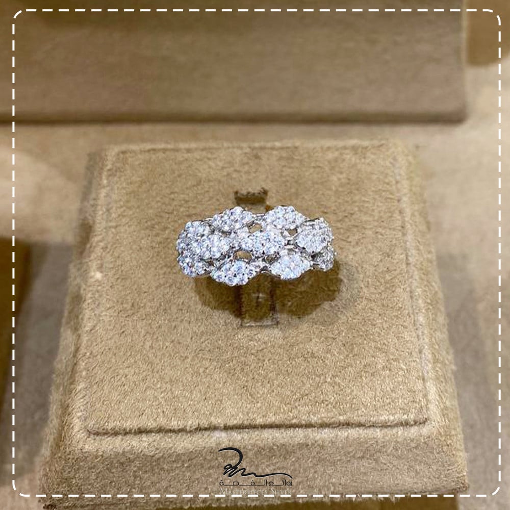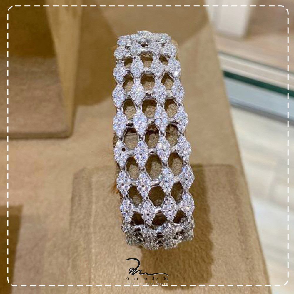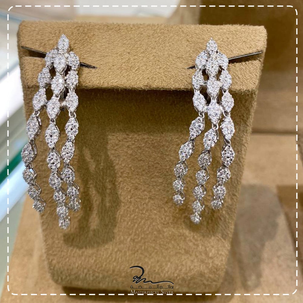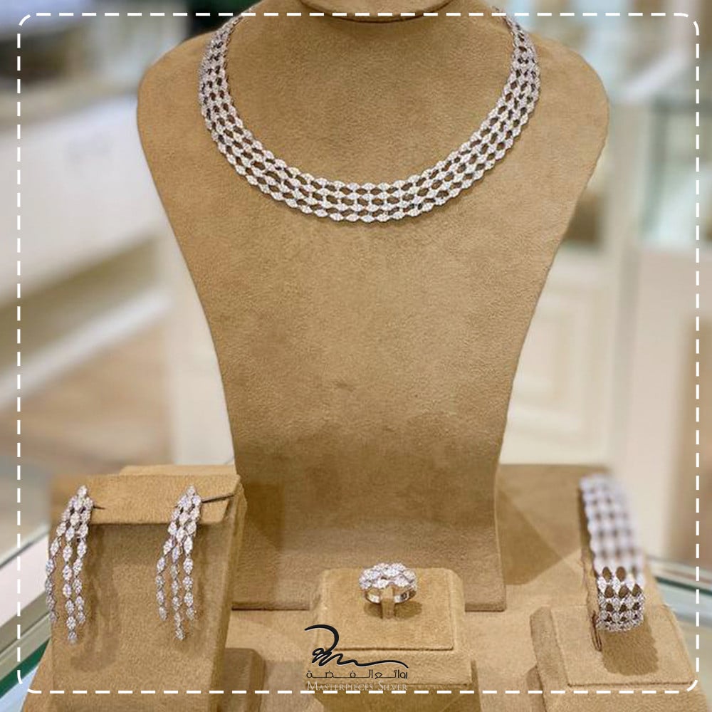 طقم فضة الماسي من روائع الفضة، صمم هذا الطقم ليعطيكي اطلالة مميزة حيث صمم على ايادي مصممين عالمين لمجوهرات الفضة عيار925, جاء الطقم الفضه يجمع بين التصاميم الافتة بين الفخامة و والرقي بتصميم الطقم احجام واشكال مختلفة اوراق بآحجار الزركون الامعة باحجام مختلفة براقة دقة الماس.