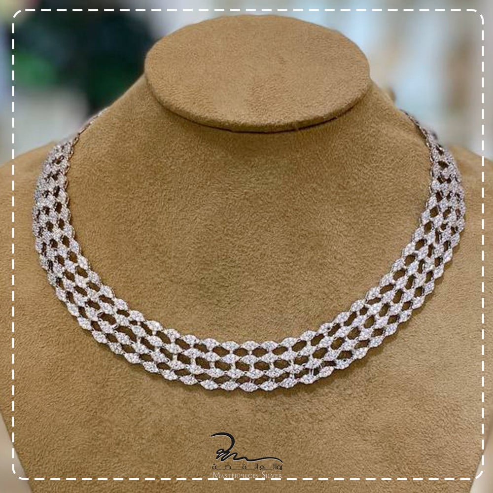 يحتوي طقم فضة النسائي على 4 قطع فضيات فخمة: ( عقد لامع مرصع بالكامل - خاتم فخم - حلق طويل - اسورة). نفس تصميم العقد.