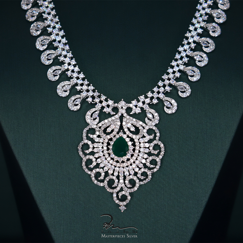 إذا كنتِ تبحثين عن إطلالة استثنائية تجمع بين الفخامة والرقي، فهذا الطقم الفضة عيار 925 هو خياركِ الأمثل! 💎 بتصميمه الفاخر المستوحى من الطراز الملكي، يأتي مرصّعًا بأحجار الزركون اللامعة مع لمسات أنيقة من الأحجار الخضراء التي تعزز جماله الفريد.