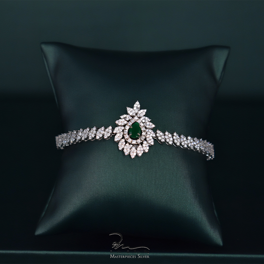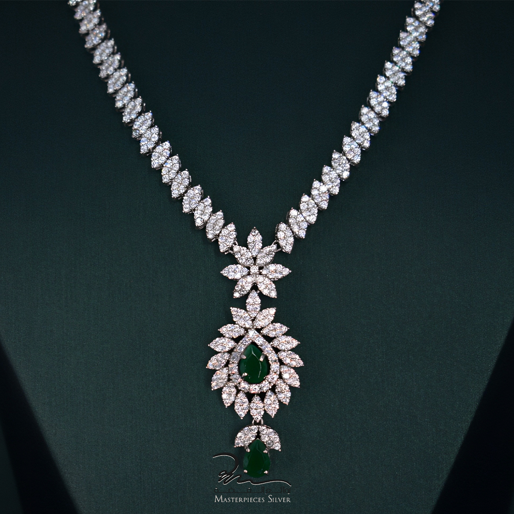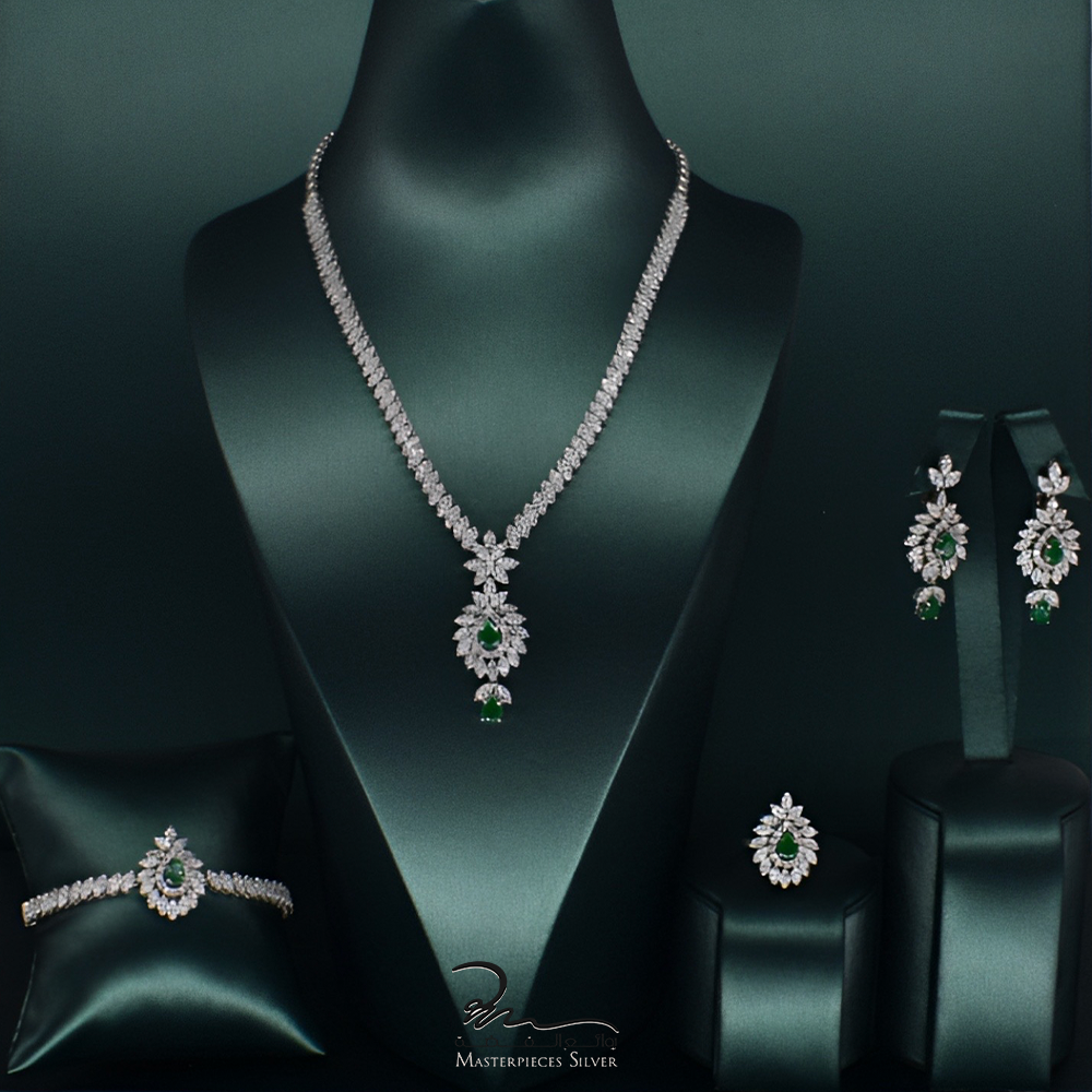 ✅ الأحجار: زركون نقي متلألئ مع لمسات من الأحجار الخضراء 💚