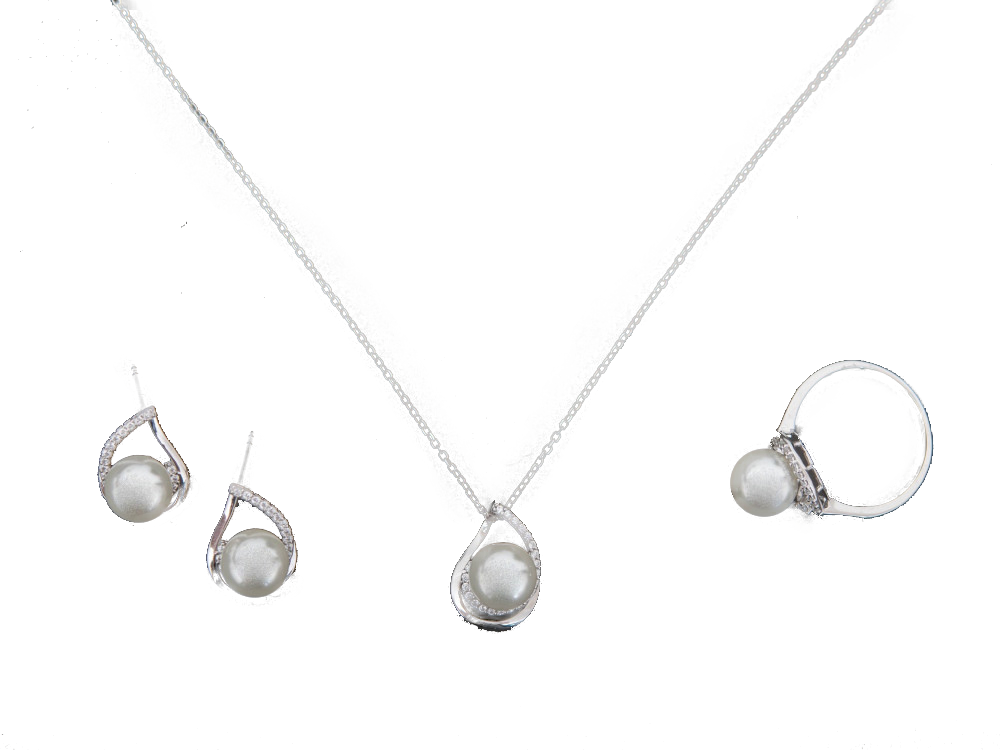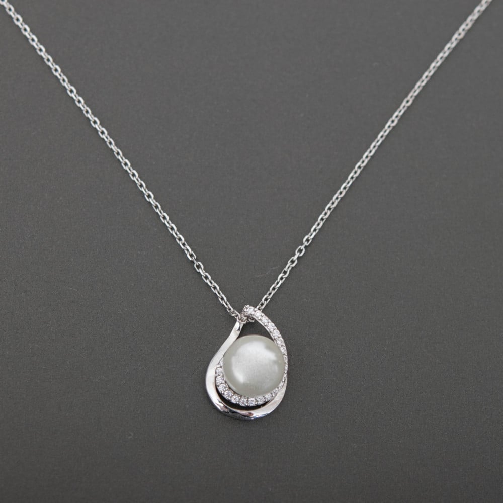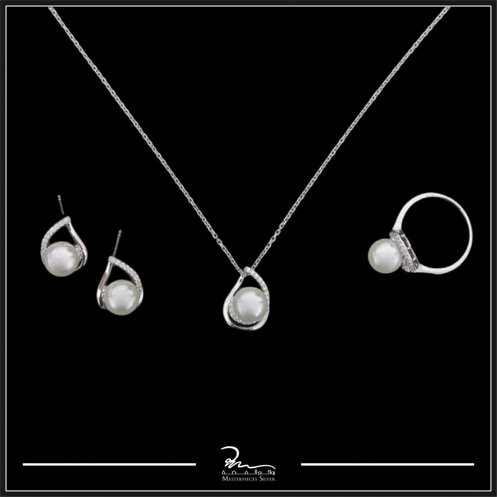 - طقم فضة كوري قلادة من الفضة عيار 925 و تنسدل منها حبة لؤلؤ زراعي ناصعة البياض كأنها قمر يزين عنقك