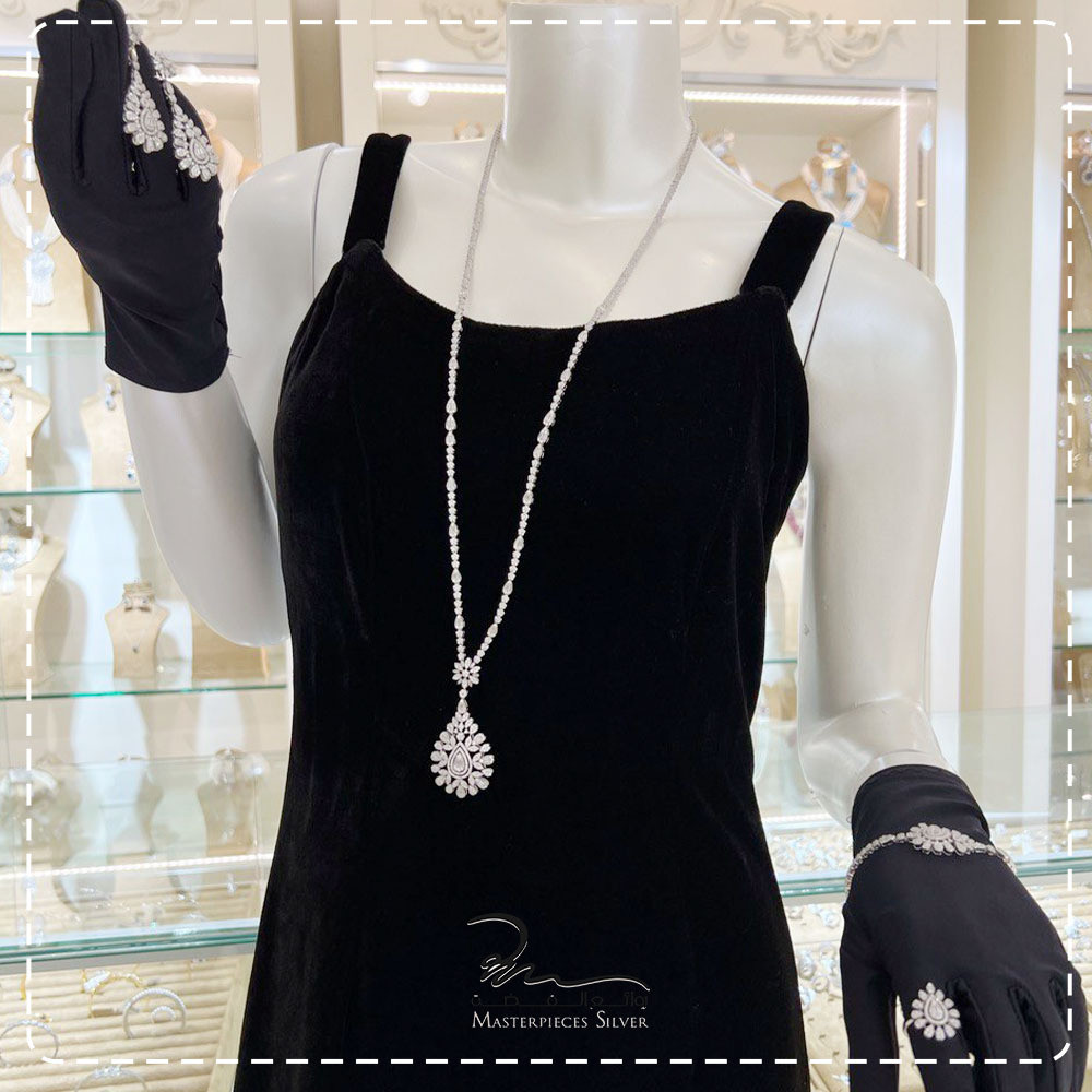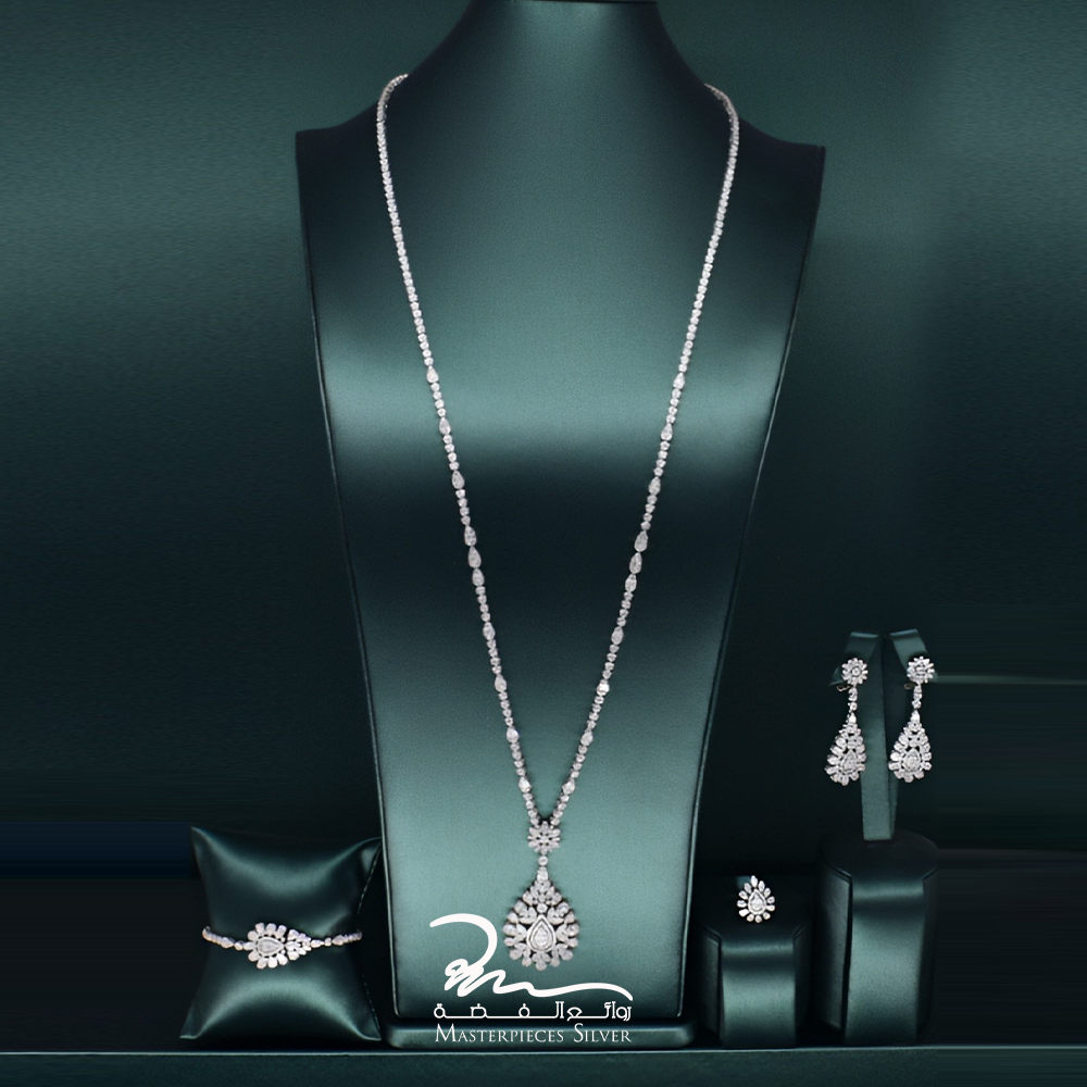 طقم فضة مرصع بالزركون تصميم الماس مرصع بمجموعة من قطع المجوهرات الفضة الفخمة، التي تناسب فقط صاحبات الذوق الرفيع، فتم