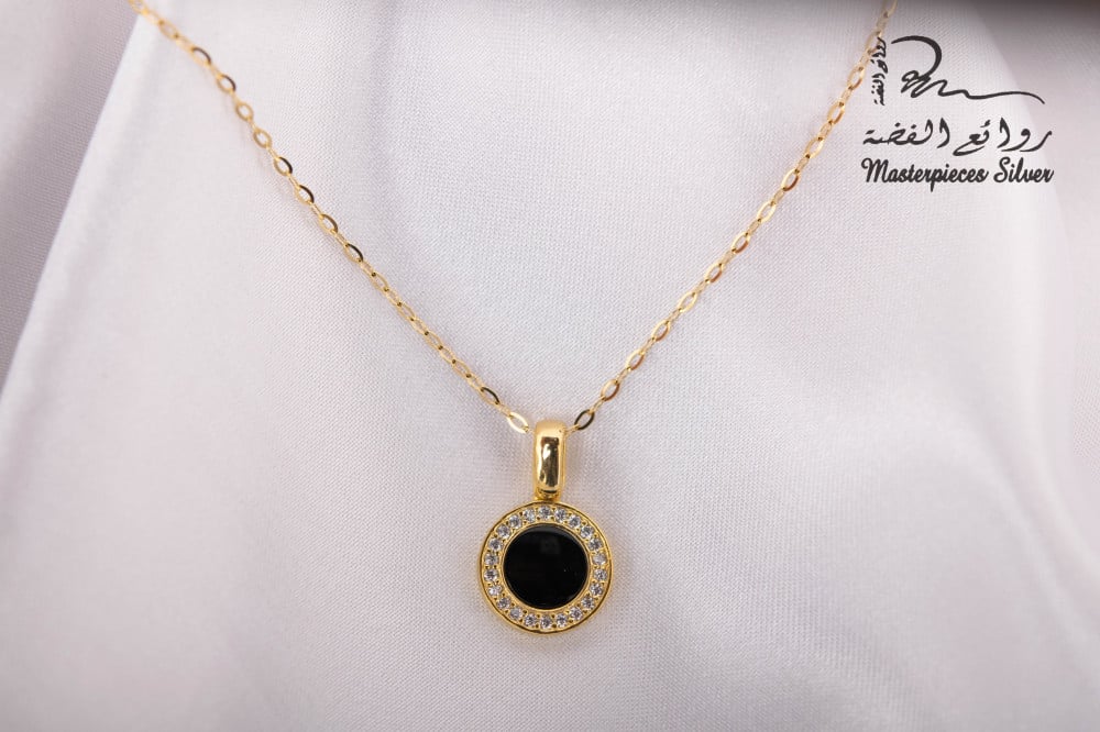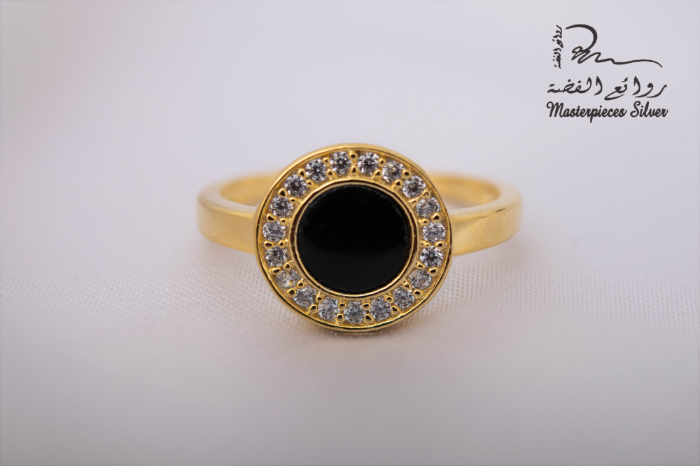 - غارق بين ماء الذهب طقم دائرى التصميم حيث حجر الأونيكس الأسود تدور حوله فصوص الزركون الأبيض اللامع كالماس يدور في مجرة تضيء الكون