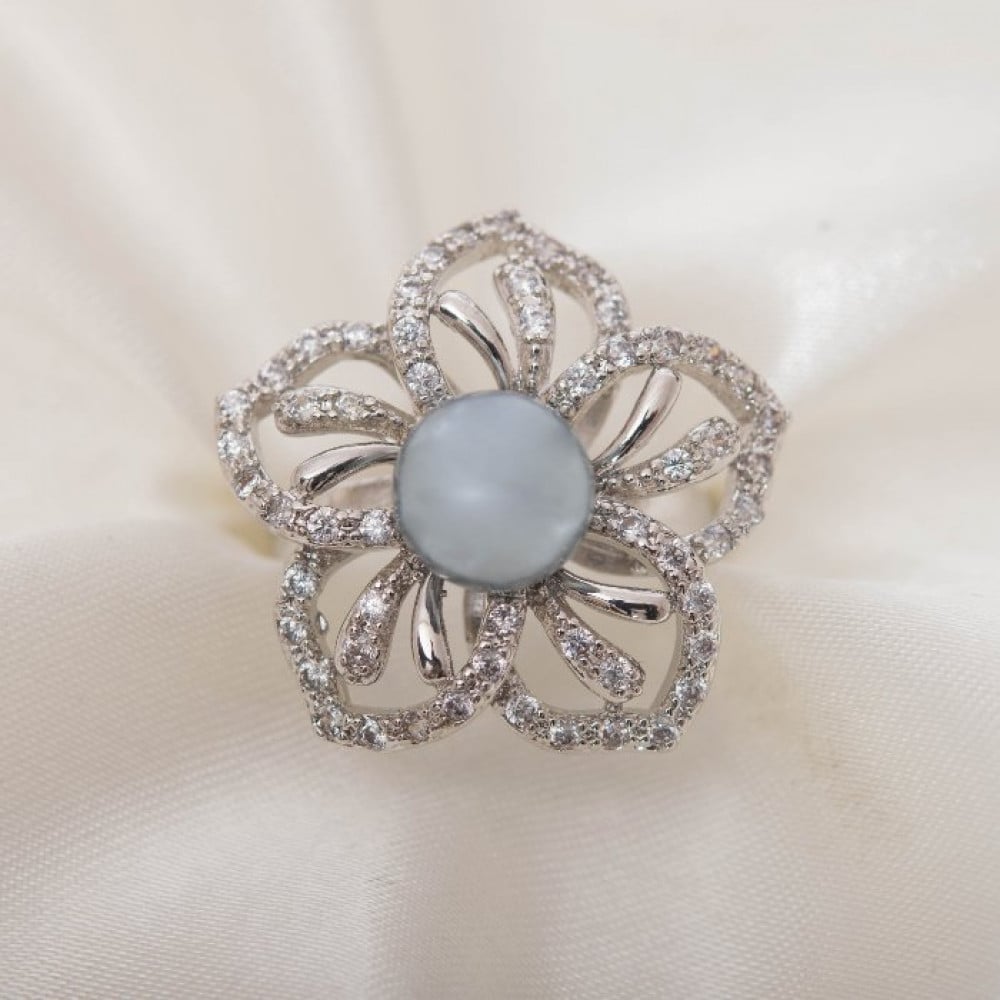 - تميز الخاتم بسحر رائع وردة كبيرة كملكة توجتها حبة لؤلؤ سقطت بقلبها وامتلأت بفصوص الزركون
