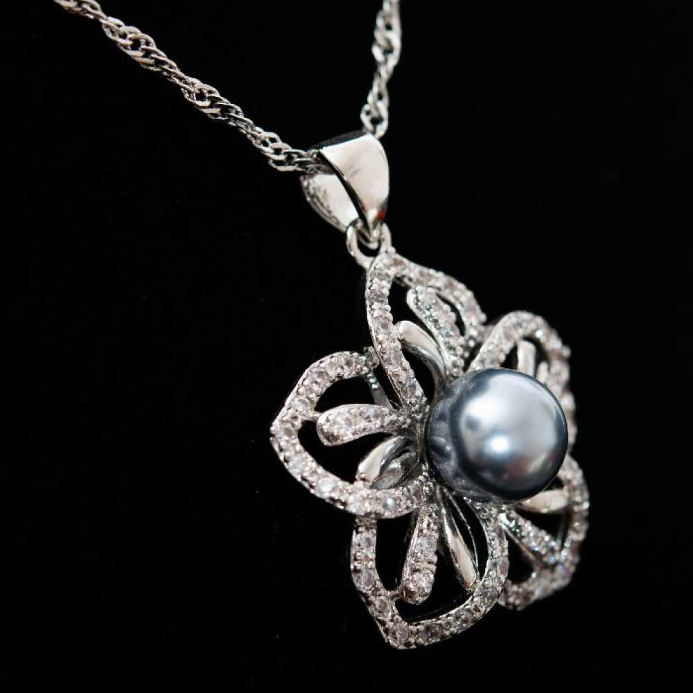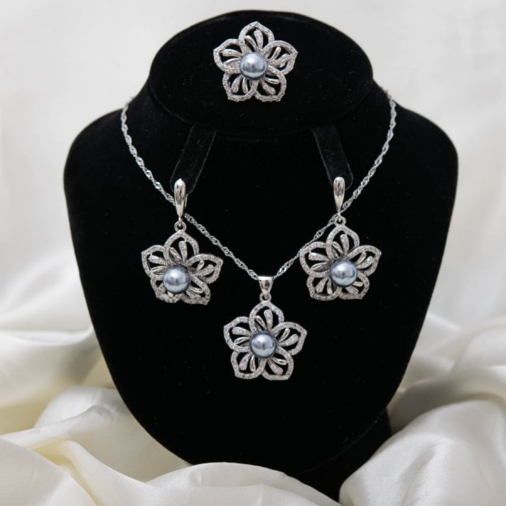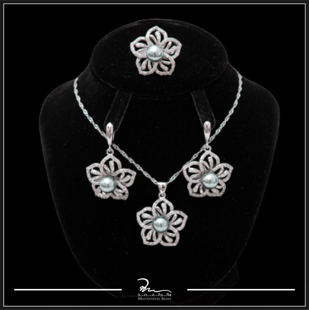 - طقم فضة نسائي، من الورود التي زينت قلبها حباب اللؤلؤ الزراعي وتراقصت على أوراقها فصوص الزركون لتمنحك سحر الألماس