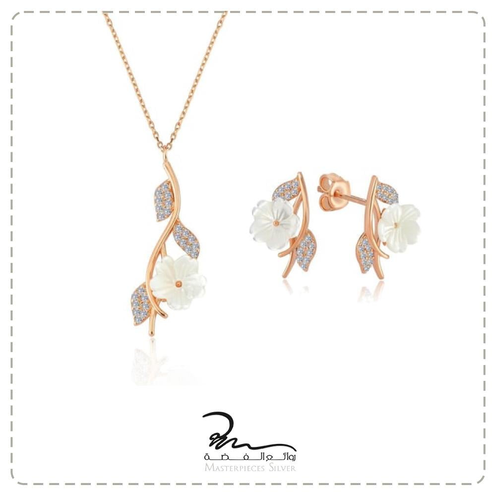 طقم فضة ناعم فاخر يتكون من قلادة وأقراط بتصميم أنيق مستوحى من الطبيعة. يتميز الطقم بوردة بيضاء تتوسطها تفاصيل ذهبية محاطة بأوراق ذهبية مرصعة باحجار الزركون تمنحها لمسة من الفخامة والرقي. هذا الطقم مصنوع بدقة وإتقان ليمنحك إطلالة ساحرة وجذابة في كافة المناسبات.