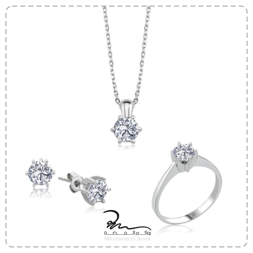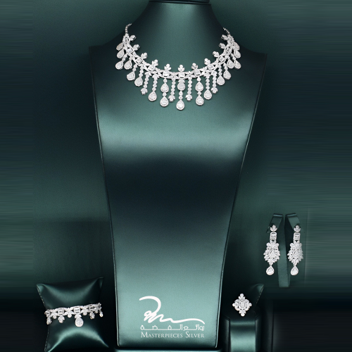 الطقم مصنوع من فضة عيار 935، ما يضمن لك بريقًا دائمًا وجودة لا تضاهى. الفضة عيار 935 تُعد من أفضل أنواع الفضة المستخدمة في صناعة المجوهرات بفضل متانتها ولمعانها الفاخر.