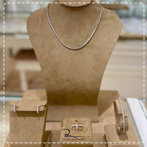 الطقم مصنوع من فضة عيار 935، ما يضمن لك بريقًا دائمًا وجودة لا تضاهى. الفضة عيار 935 تُعد من أفضل أنواع الفضة المستخدمة في صناعة المجوهرات بفضل متانتها ولمعانها الفاخر.