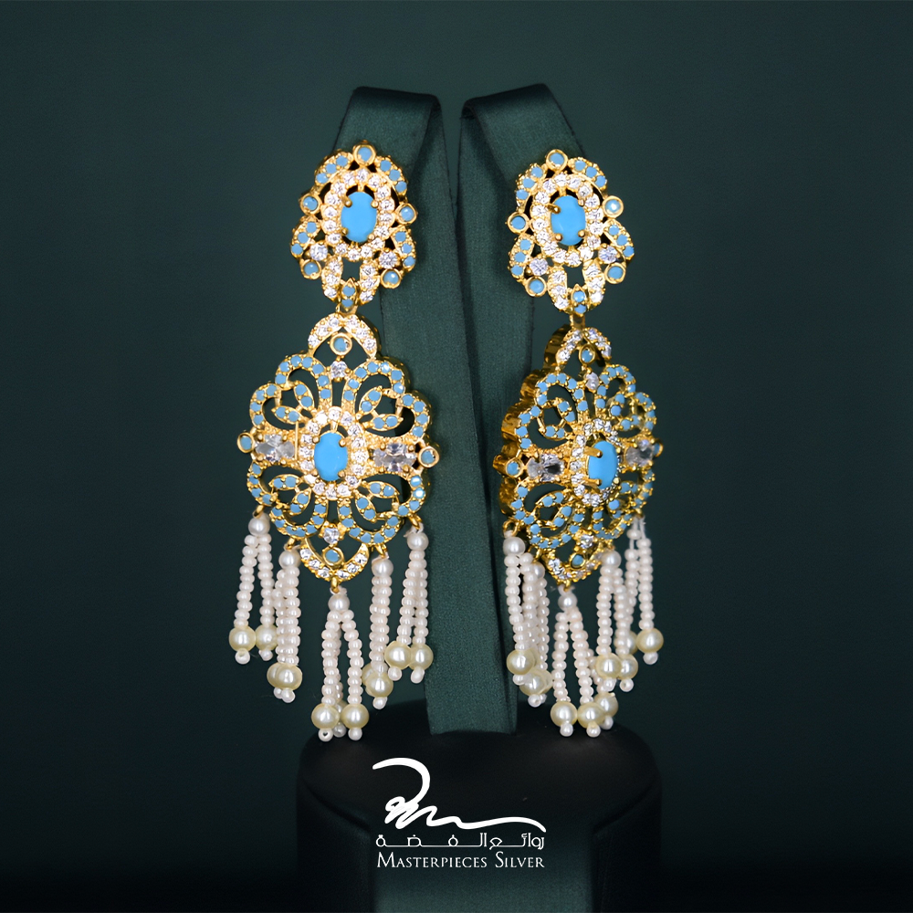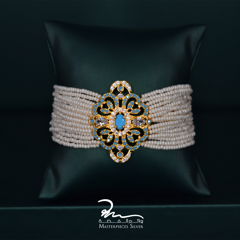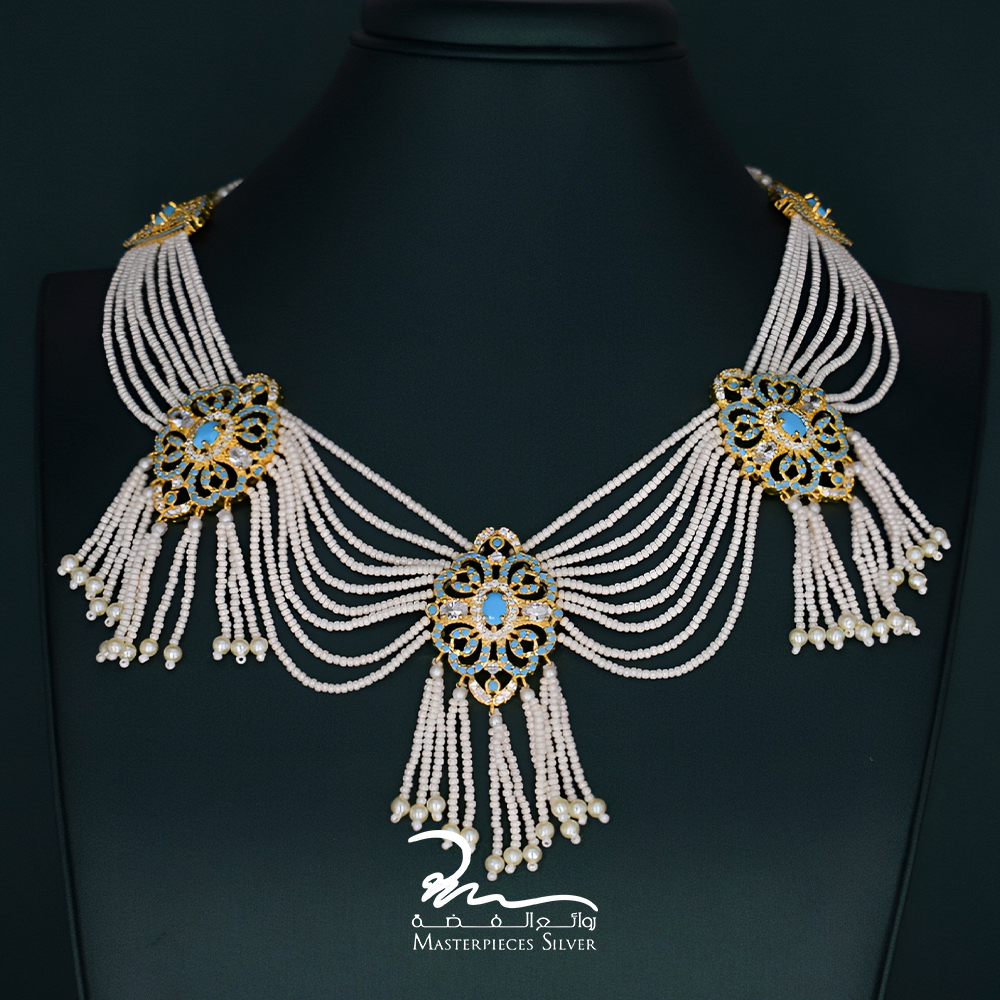ارتقِ بإطلالتك مع هذا الطقم الفاخر المصنوع من اللؤلؤ الزراعي الطبيعي والفضة النقية، والمصمم بعناية فائقة ليجسد سحر الشرق وأناقة الماضي بلمسة عصرية. يتميز طقم اللولو من توقيع Masterpieces Silver، بتفاصيل يدوية دقيقة وزخارف ذهبية أنيقة تتوسطها أحجار زرقاء فيروزية تمنح كل قطعة جاذبية ملكية لا مثيل لها.